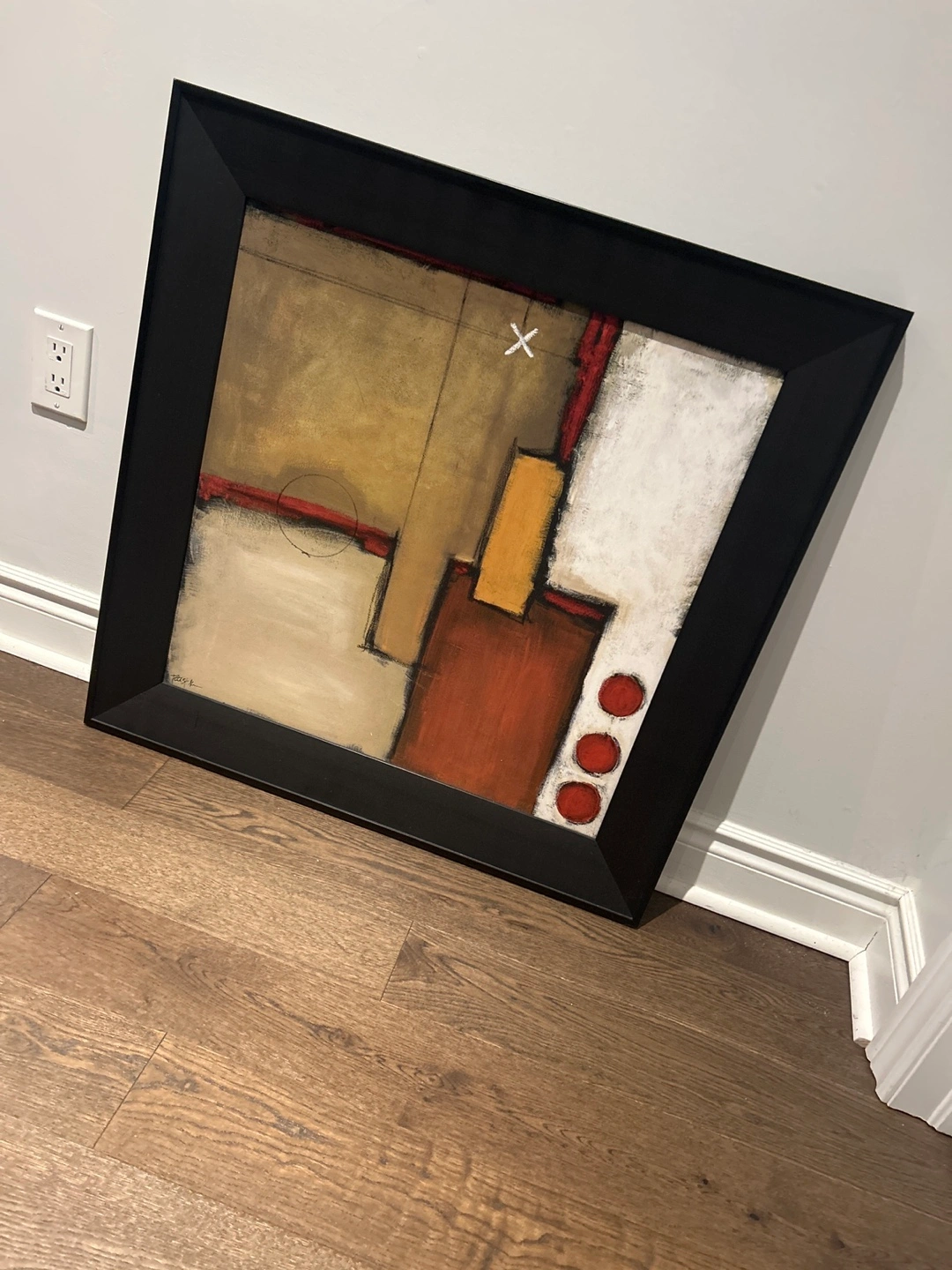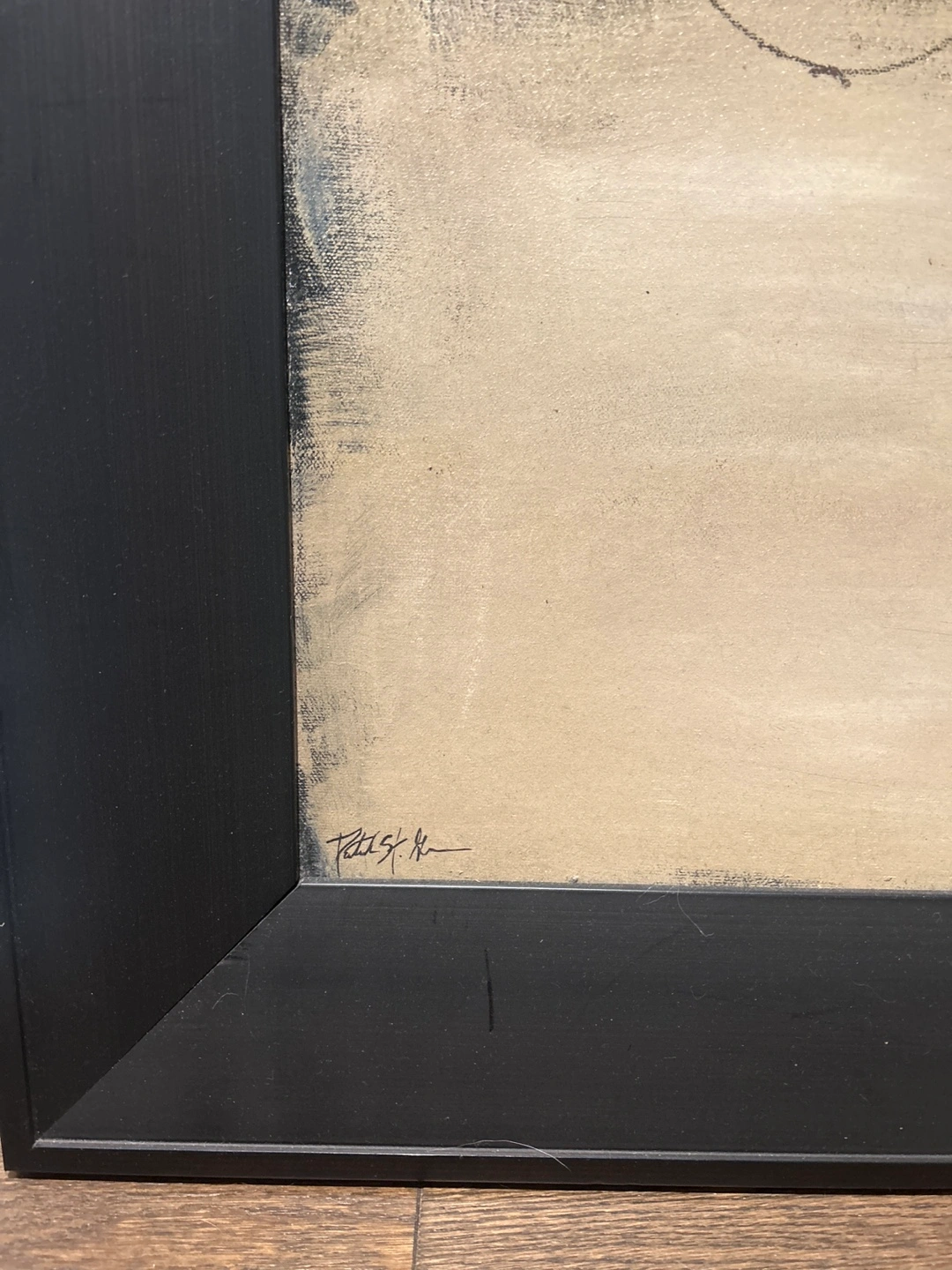 Large framed abstract painting. Neutral colours. Black frame. Artist signature in bottom corner.