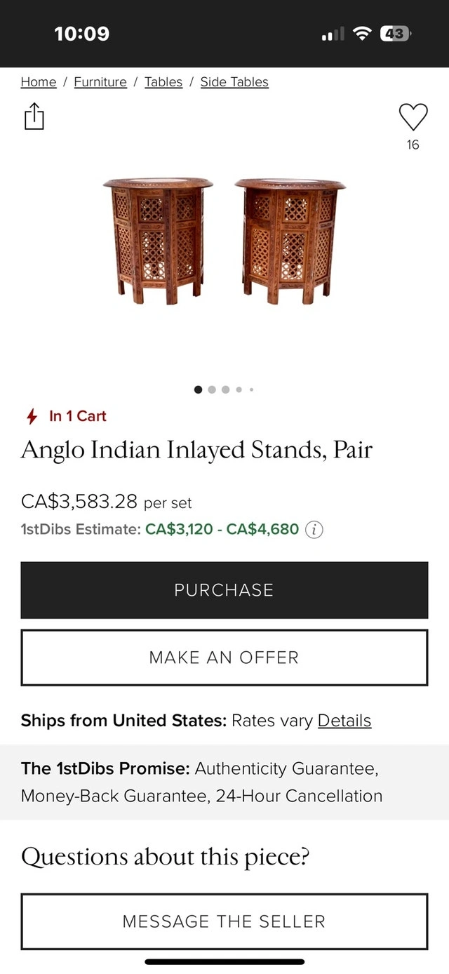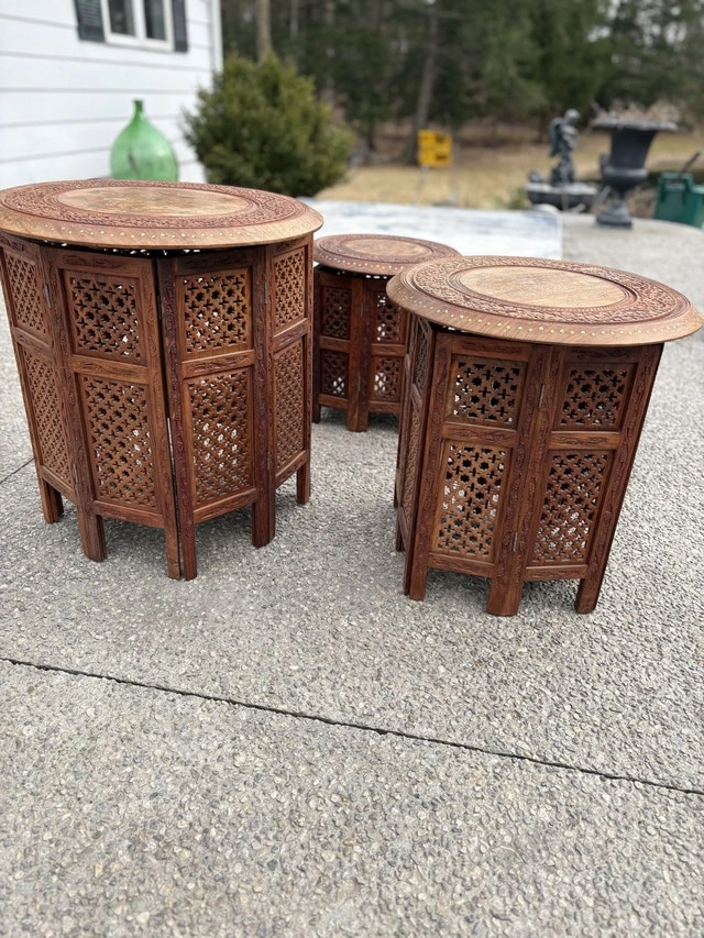 Beautifully hand-carved teak side table from the 1950s, featuring intricate brass inlays on the center top and around the edge. This table is collapsible, making it a great space-saving option. Measures 18" in diameter. Used, but in like-new condition. Cash accepted.