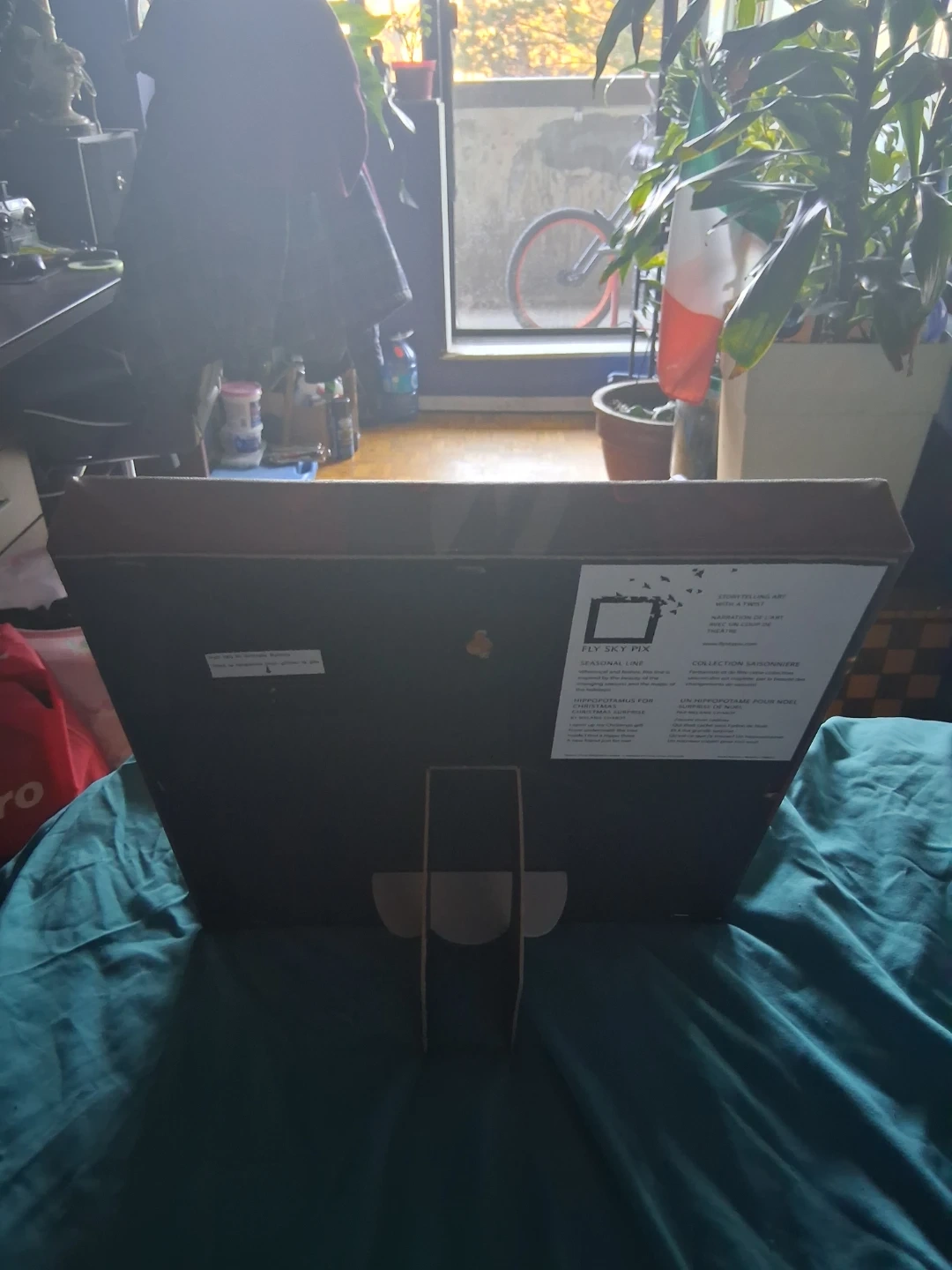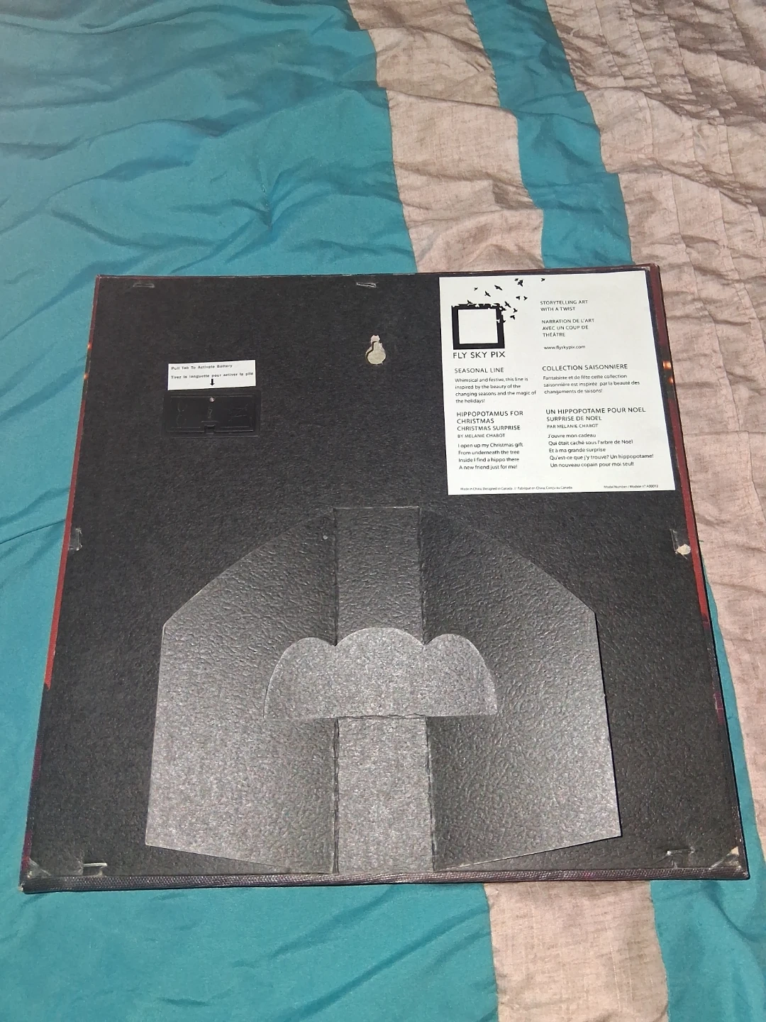 This Fly Sky Pix art piece is from their seasonal line, inspired by the holidays. The art is titled "Hippopotamus for Christmas" and is by Melanie Chabot. It depicts a girl opening a gift with a hippopotamus. It's designed in Canada. Can be put on the wall or use the pop out stand to stand on desk, dresser, table, etc. Takes 2 button batteries as the art sings "All I want for Christmas is a hippocampus" by pushing the button on the bottom right corner.