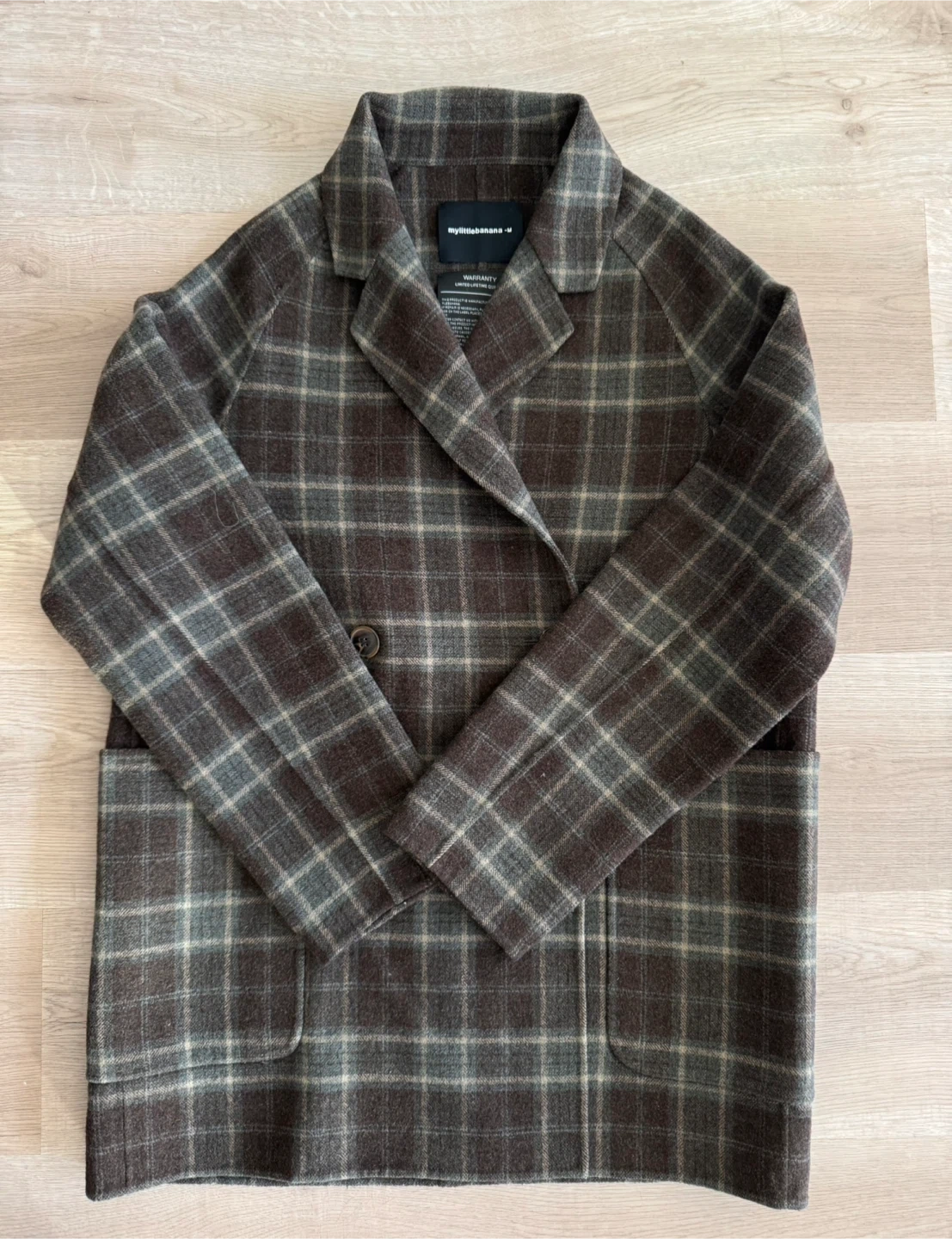 It's a double-breasted style with pockets. Measurements: 82cm in length, 55cm across the chest, and 73cm for the sleeve length