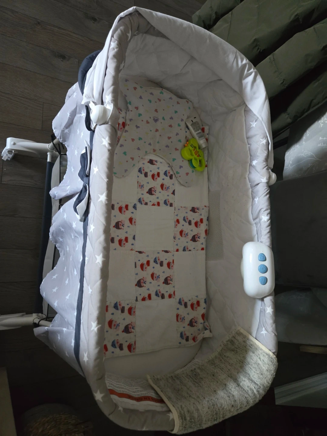 This is a grey bassinet with a white star pattern. It has a fitted sheet and a mobile. The bassinet comes with a convenient storage basket underneath. A toy is included.
