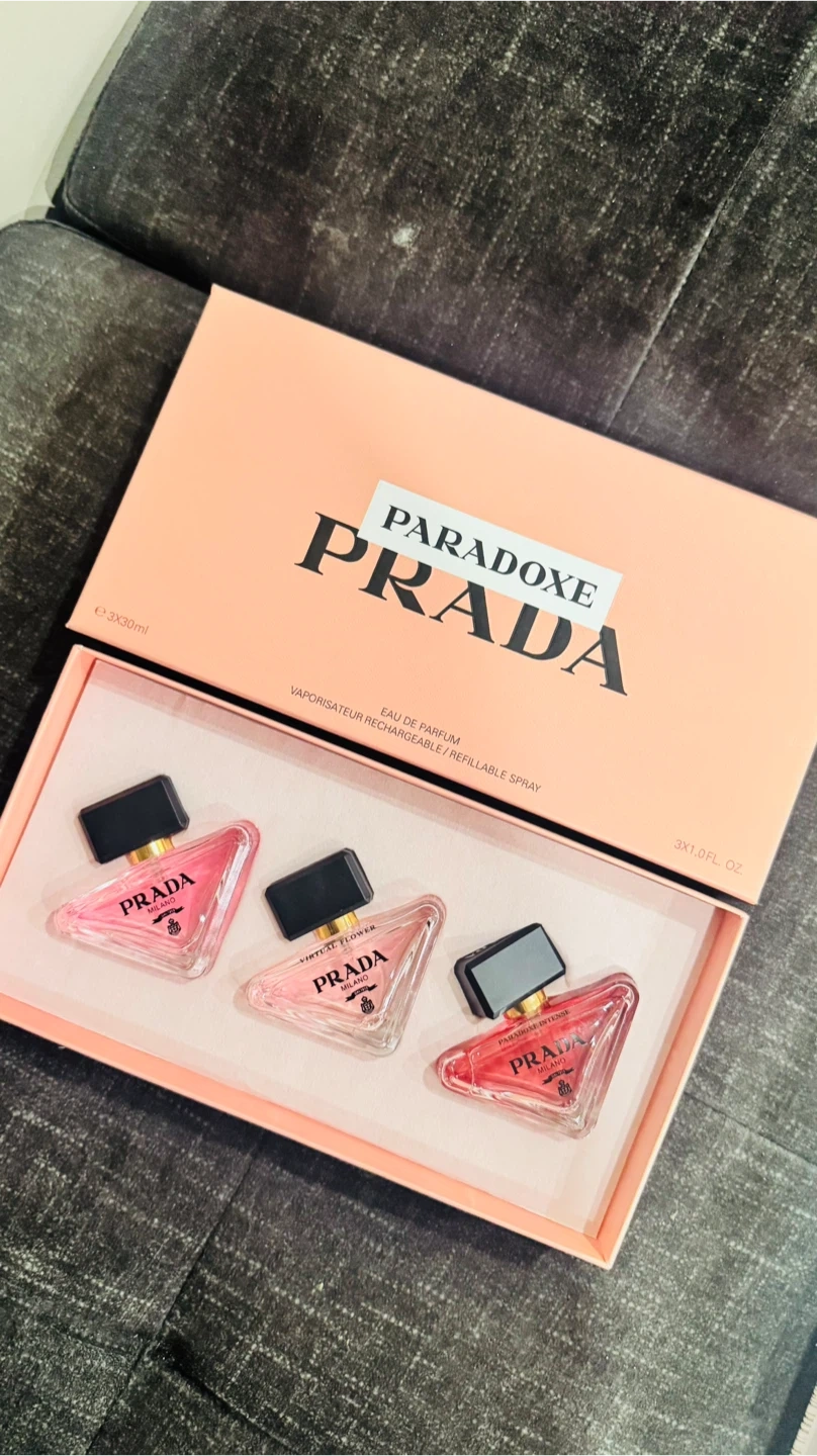 This Prada Paradoxe set includes three 30ml refillable spray bottles of Eau de Parfum. It features 'Virtual Flower' and 'Paradoxe Intense' scents. Great for trying out different fragrances!