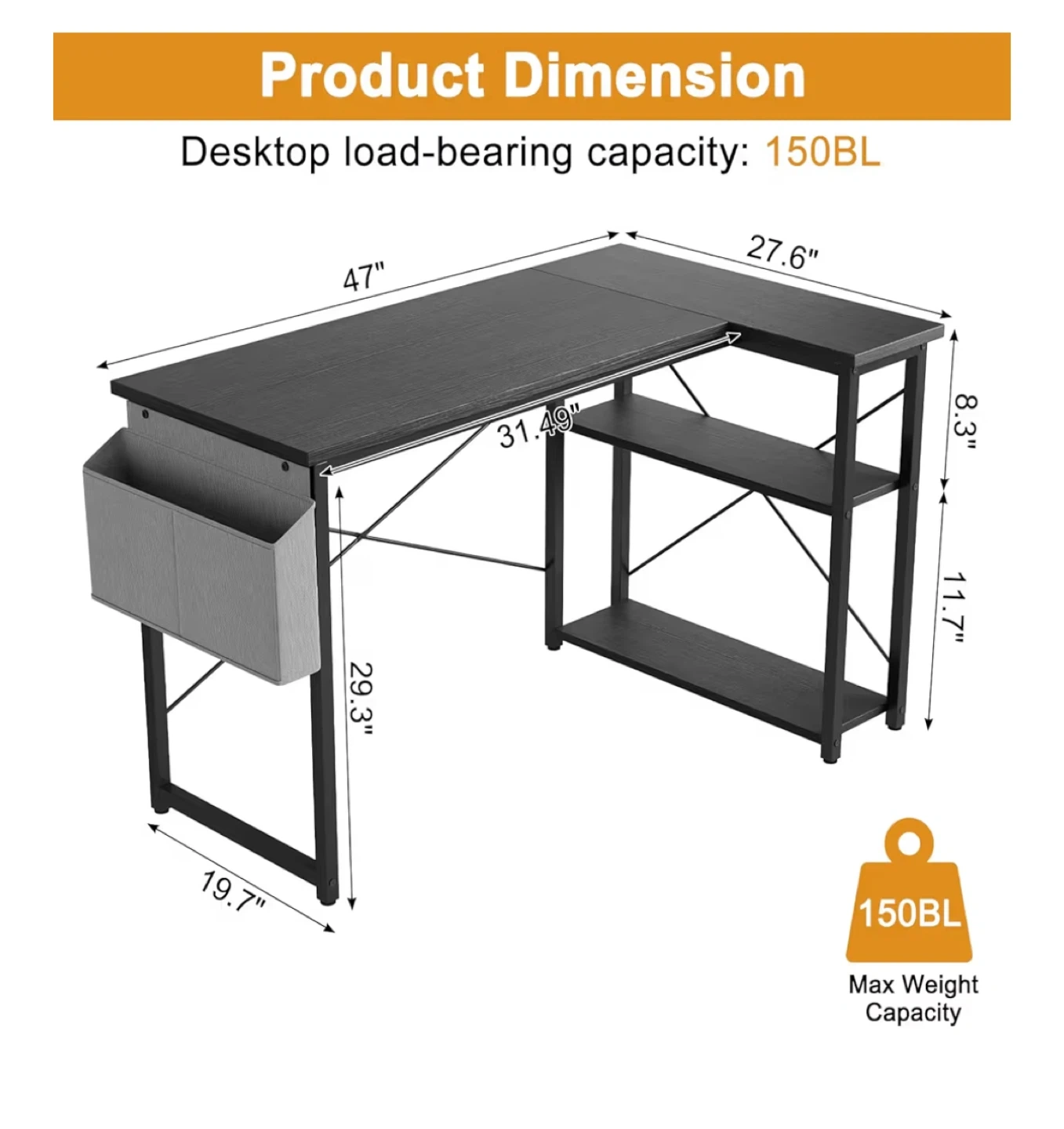 This L-shaped desk offers a spacious work surface with a built-in storage shelf. It's made with a black finish and includes a handy side fabric organizer for your essentials. The desktop has a load-bearing capacity of 150 lbs.