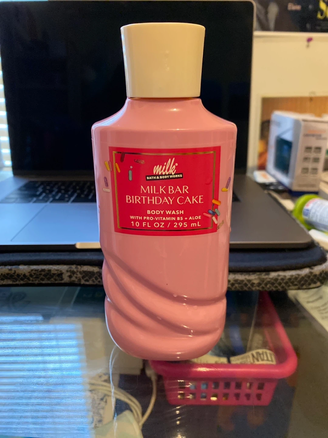 This is the Bath & Body Works Milk Bar Birthday Cake body wash. It's 10 FL OZ (295 mL) and contains Pro-Vitamin B5 and Aloe. This body wash is great for a refreshing shower experience!