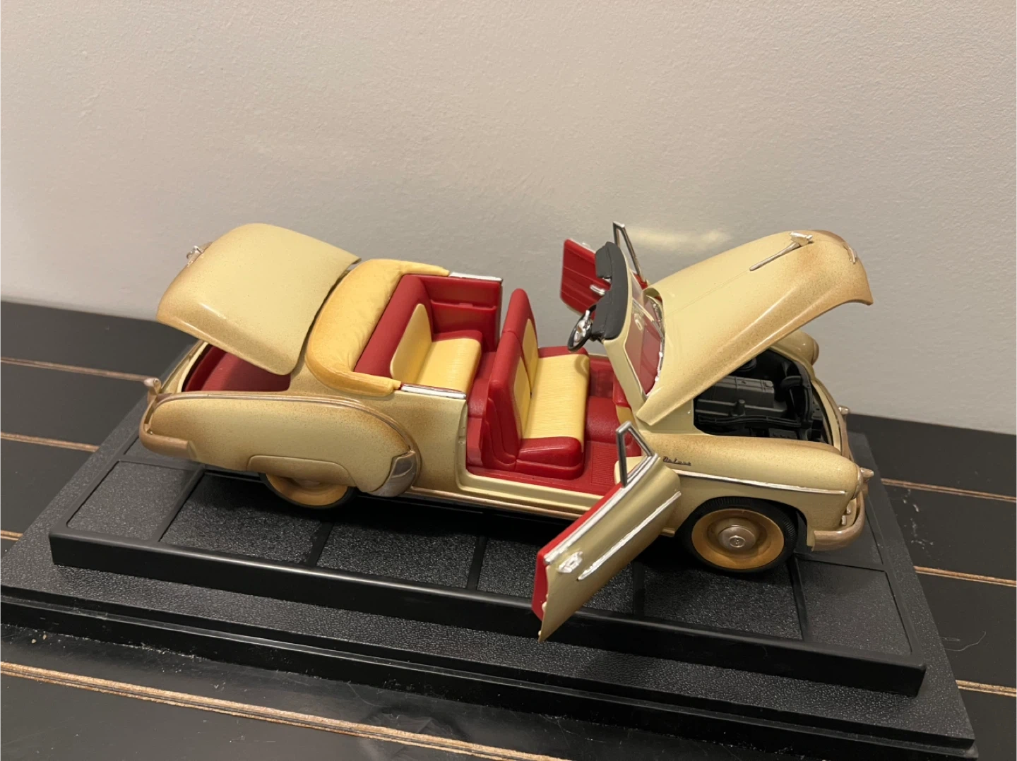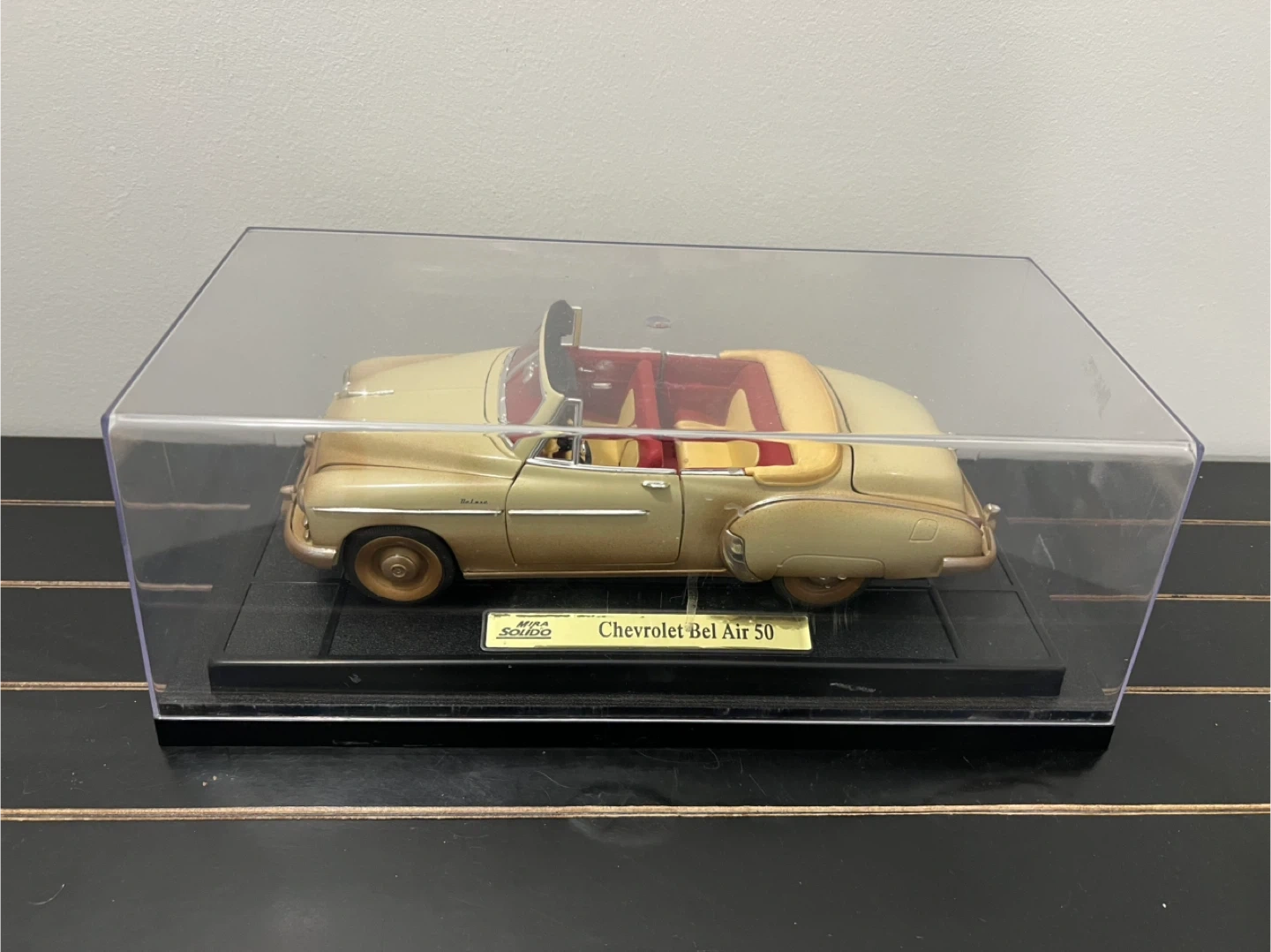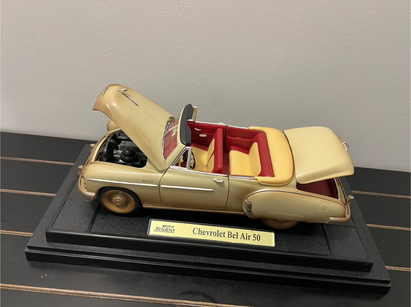 This is a MIRA Solido die-cast model of a 1950 Chevrolet Bel Air convertible. It's a 1:18 scale model with opening doors, hood, and trunk. The interior and engine bay are detailed. Comes displayed on a black base with a clear plastic case.