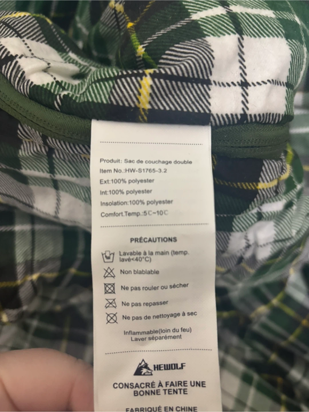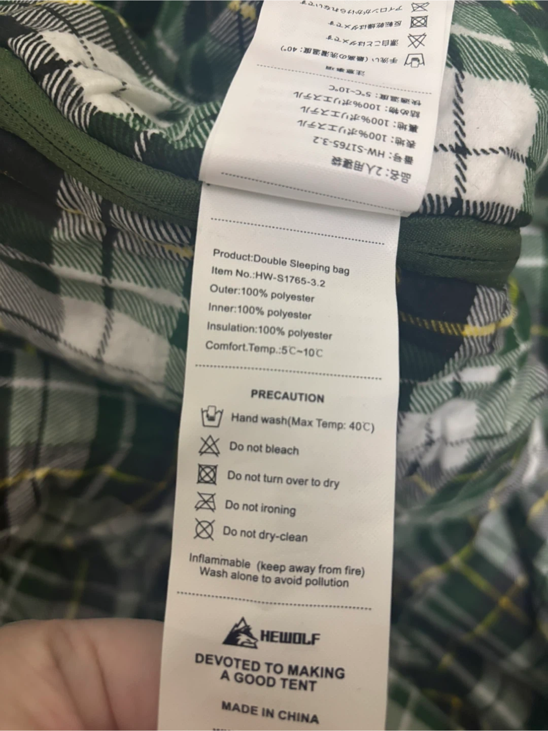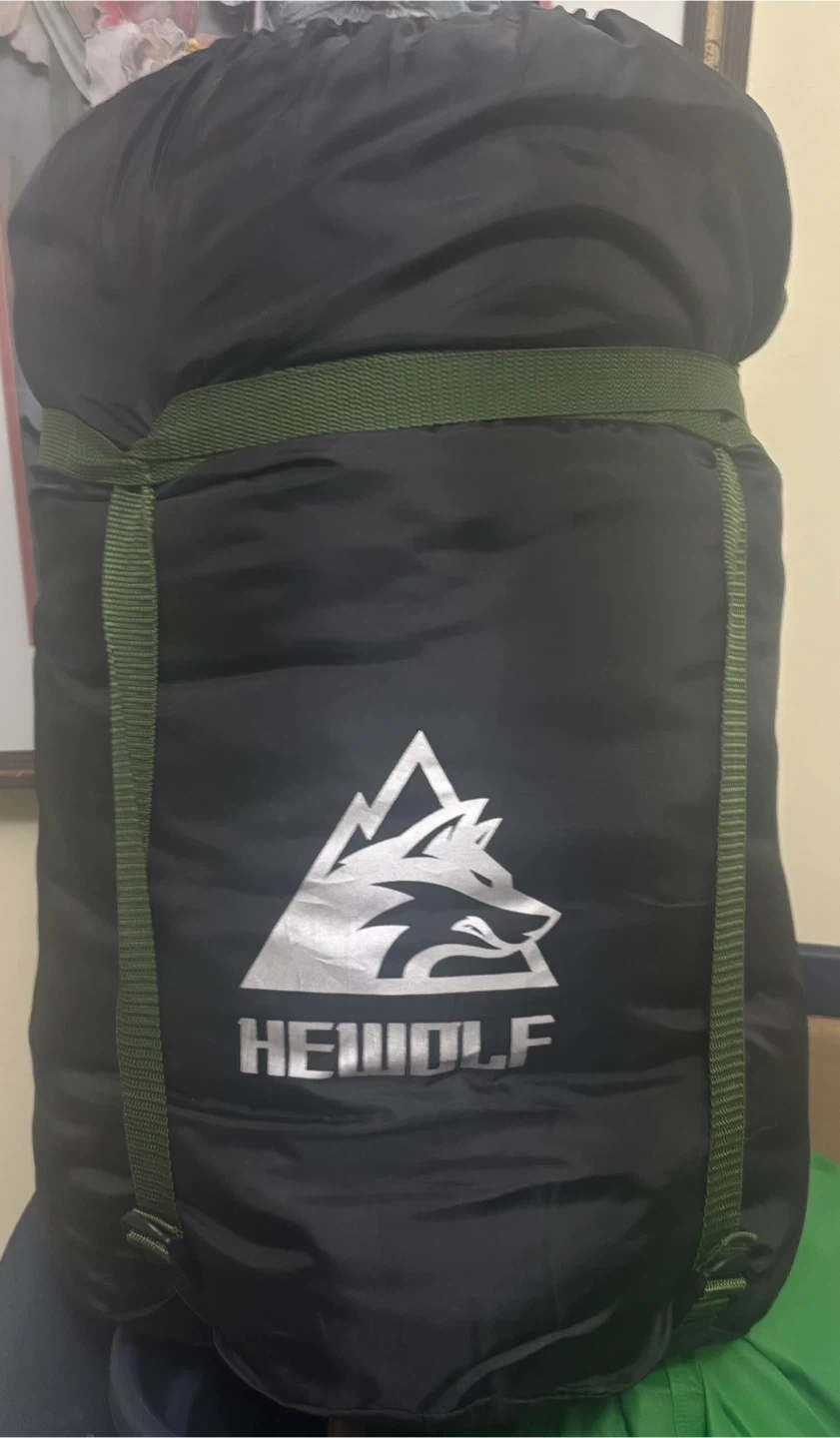 I'm selling a Hewolf Double Sleeping Bag, perfect for camping! It's waterproof and extra wide, making it great for two people. The sleeping bag is green and suitable for both indoor and outdoor use. It has a comfort temperature of 5°C to 10°C. The outer, inner, and insulation are all made of 100% polyester
