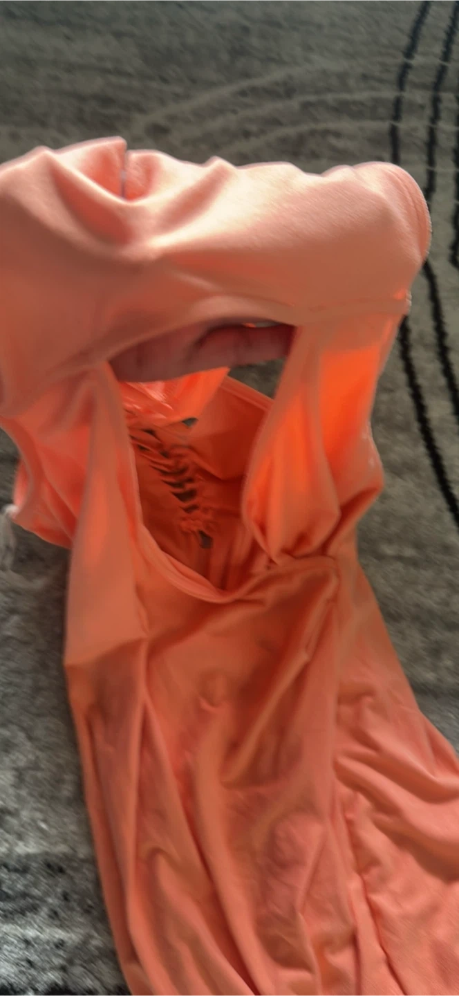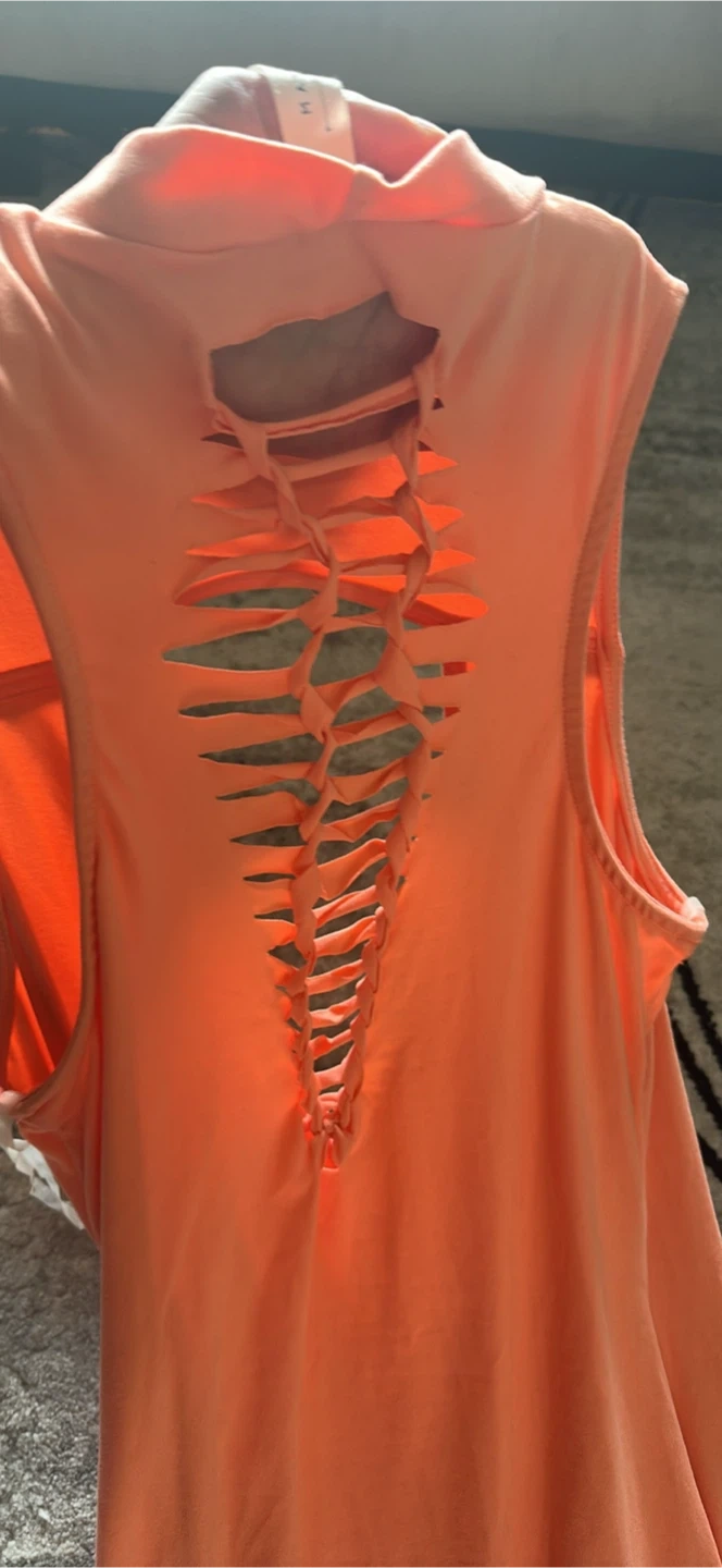 This is a stylish orange sleeveless dress that would be a great addition to your wardrobe! It features a unique cut-out design on the back.