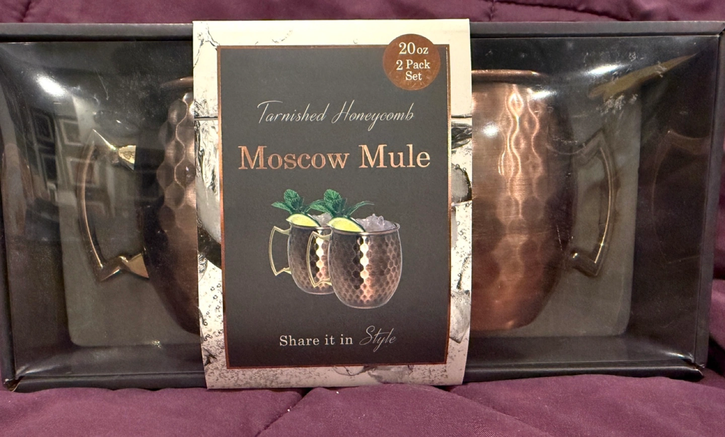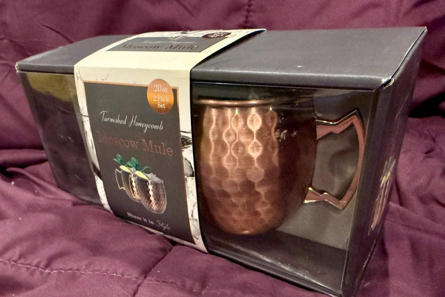 Set of 2 copper Moscow Mule mugs. 20 oz capacity. Tarnished honeycomb design. Comes in gift box as pictured (unopened)
