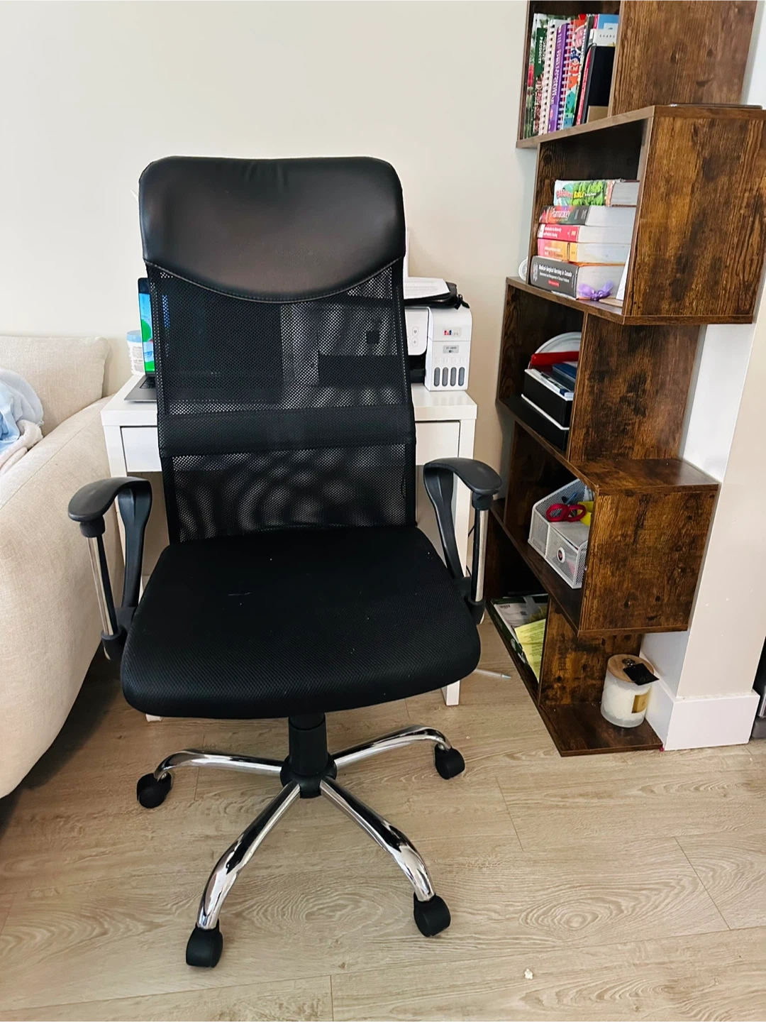 This is a black mesh office chair with padded armrests and a chrome base. It features a breathable mesh back for comfort. It swivels and has adjustable height.