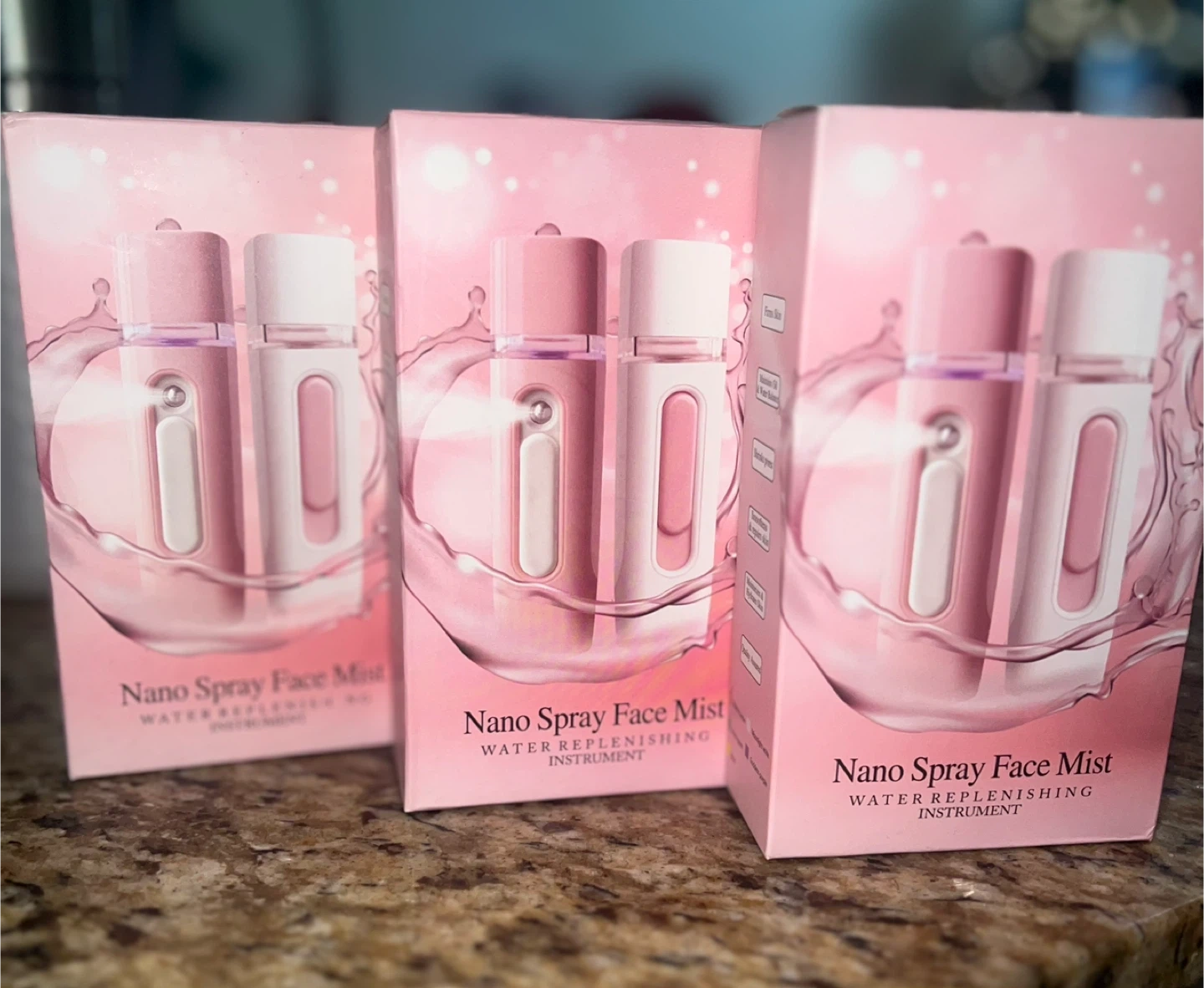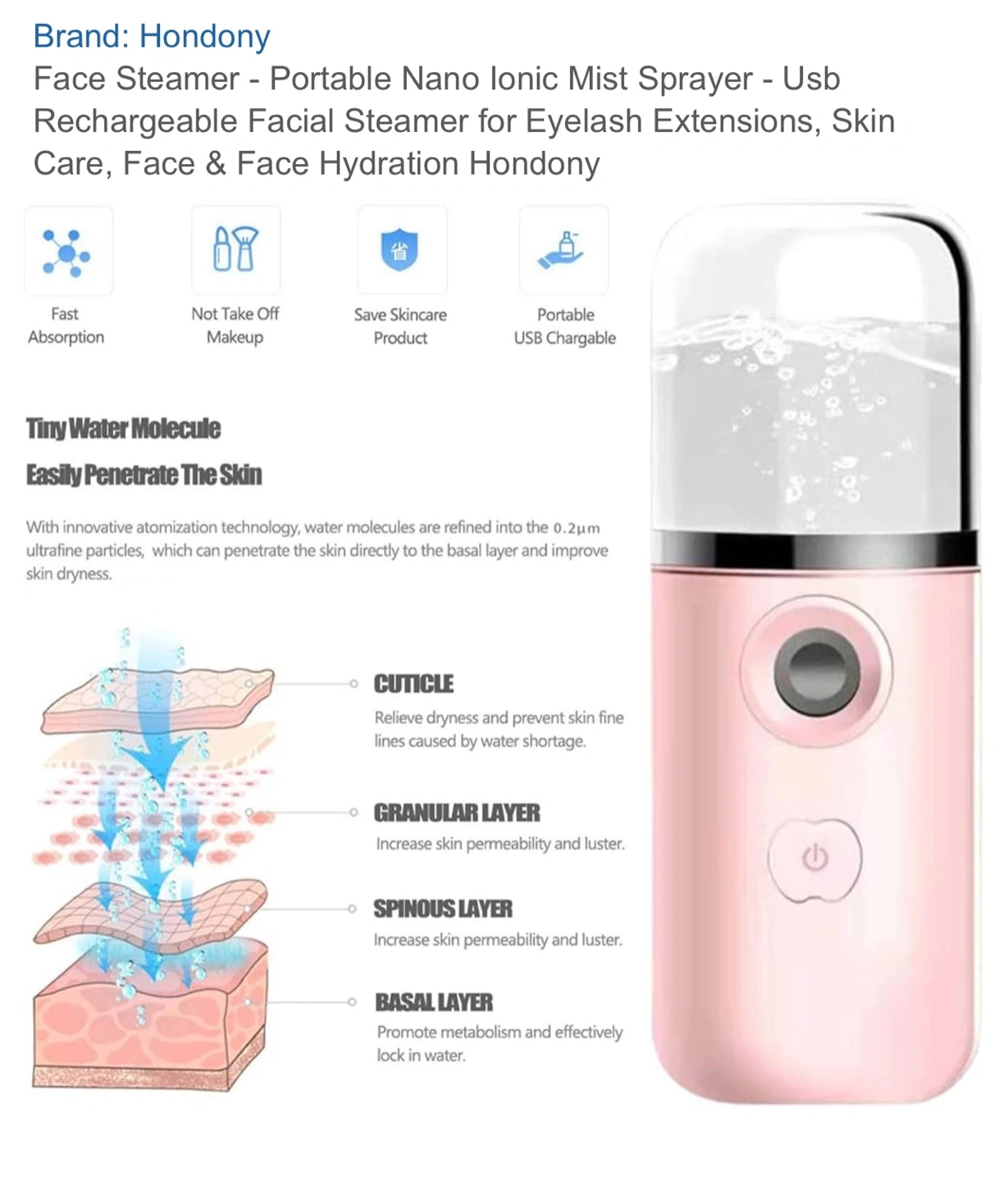 Brand new portable nano mist sprayer for your face. It's USB rechargeable and holds 35 milliliters. comes in pink.