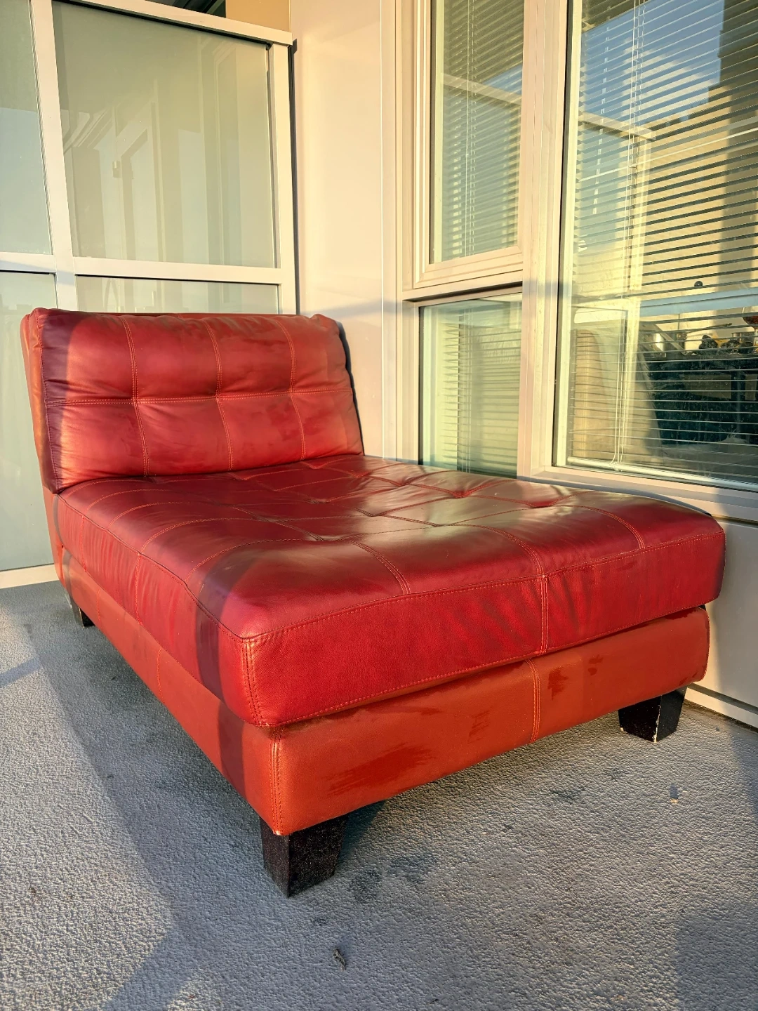 Selling a comfortable red leather chaise lounge. It's in good condition and perfect for relaxing after a long day. The leather is soft and the design is modern, making it a great addition to any living space