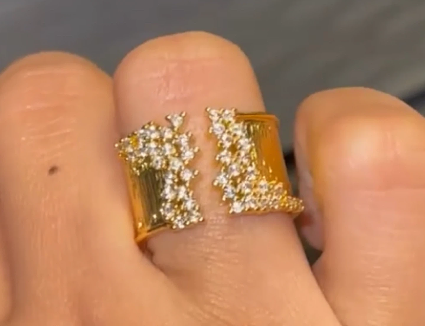 This ring features a gold-tone finish and is encrusted with sparkling crystals. It's designed with an open, adjustable band. It's a statement piece that adds a touch of glamour!