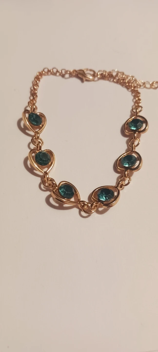 New !! A delicate gold-tone chain bracelet features oval green colored gems set in gold shaped links. It has a lobster clasp for secure fastening. This piece adds a pop of color to any outfit! 8" long, adjustable size. Excellent condition.