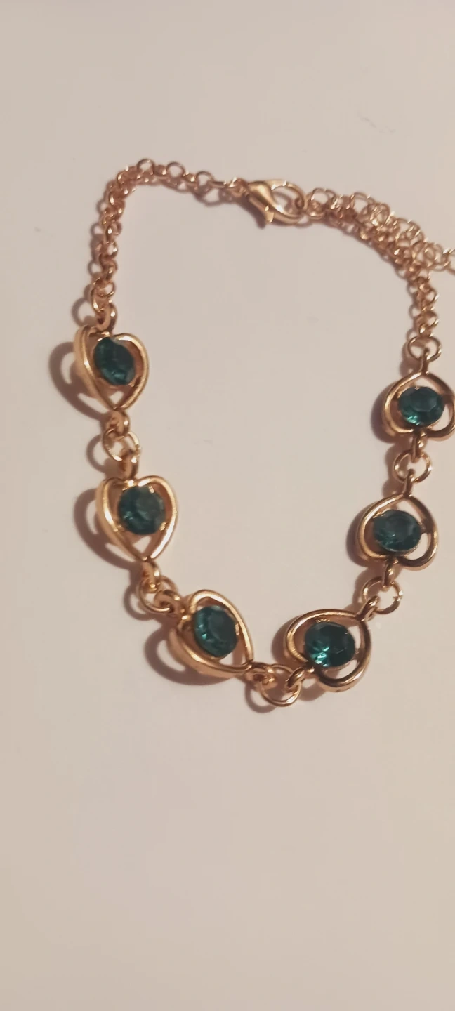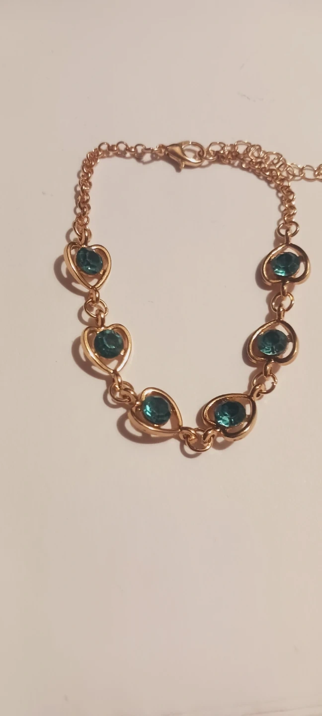 Gold-tone Chain Bracelet with Heart Shaped Charms Green Gems