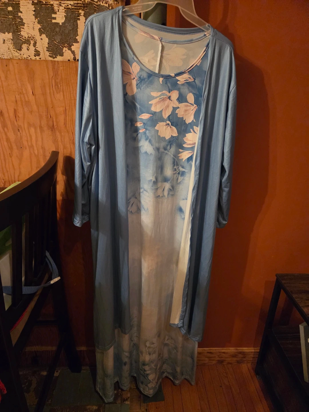 Two-piece set featuring a sleeveless maxi dress with a blue and white floral print and a matching long-sleeved blue cardigan. The dress has a round neckline and the cardigan is open-front. It's a comfortable and breezy outfit. Will fit XL to 3X but feel free to buy, try on and return ifbit doesn't fit.