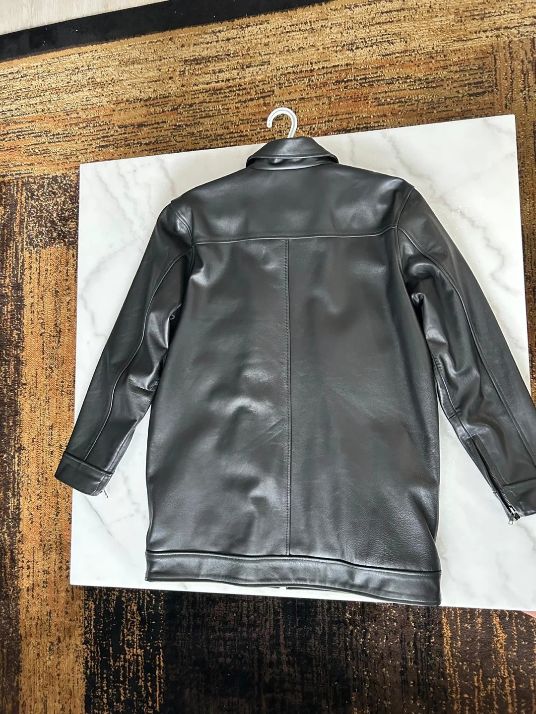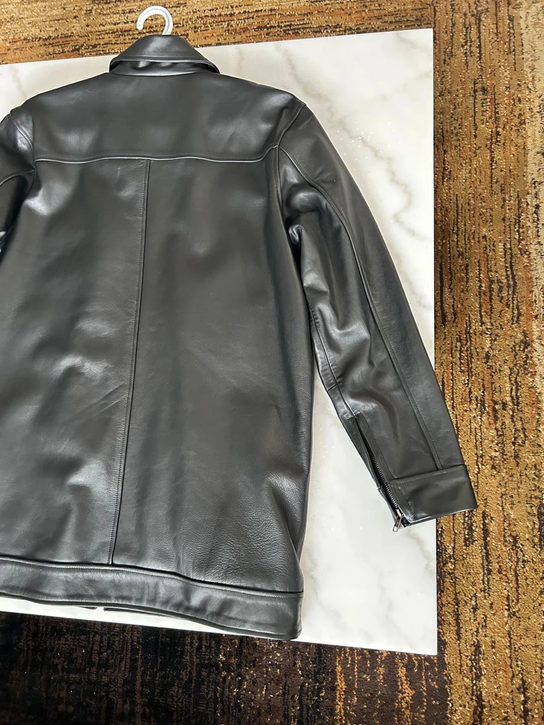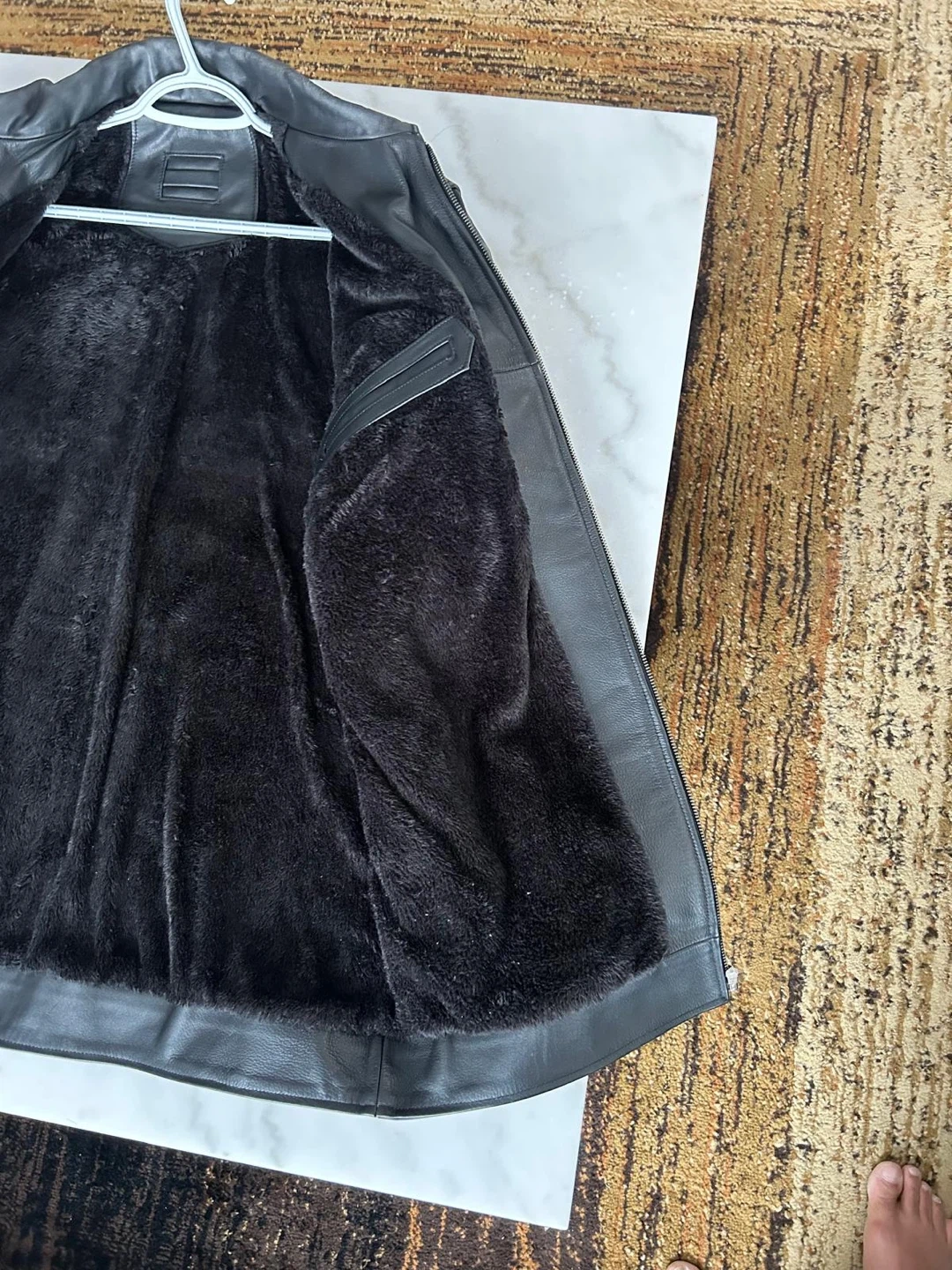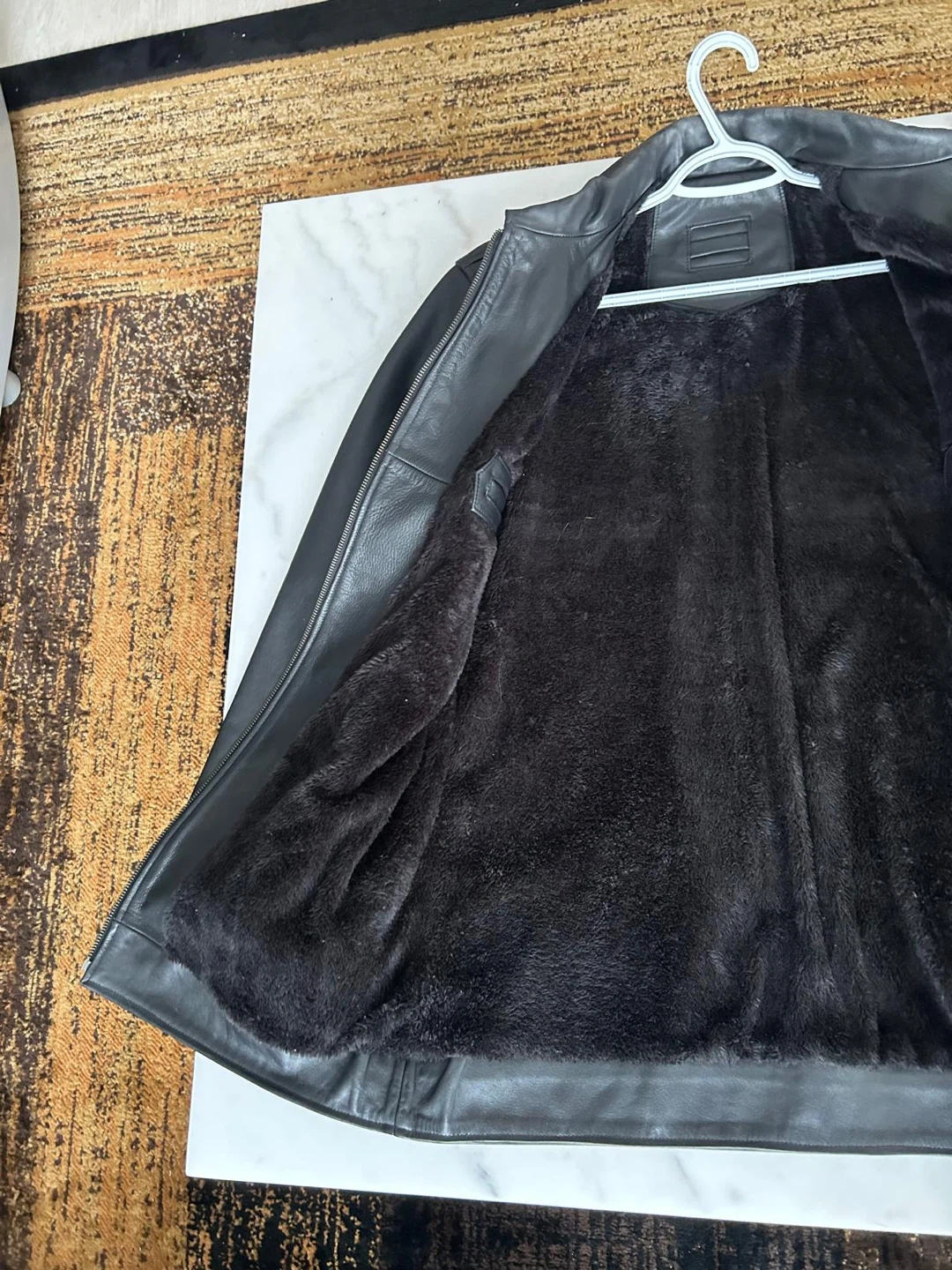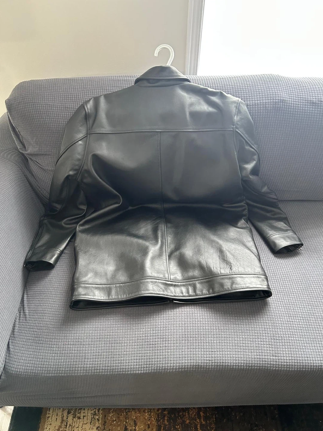 Selling a stylish black leather jacket! It's in great condition and features a zipper closure and a soft lining. Perfect for adding a touch of cool to any outfit.