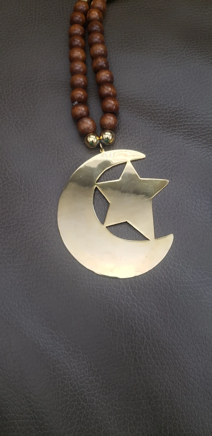 Wooden bead necklace with a large silver plated gold-toned crescent moon and star pendant. The beads are strung together with smaller gold accent beads. It's a unique piece for everyday wear or special occasions.