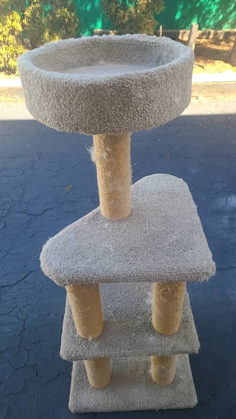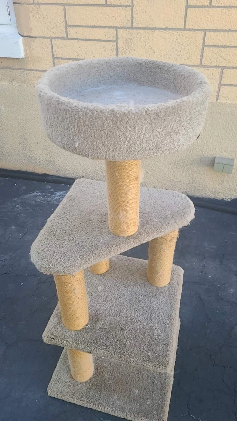 A beige multi-level cat tree featuring multiple scratching posts wrapped in sisal rope. It has several platforms and a perch for your feline friend to climb and lounge on. Cat trees are great for providing cats with vertical space for climbing, scratching, and resting!