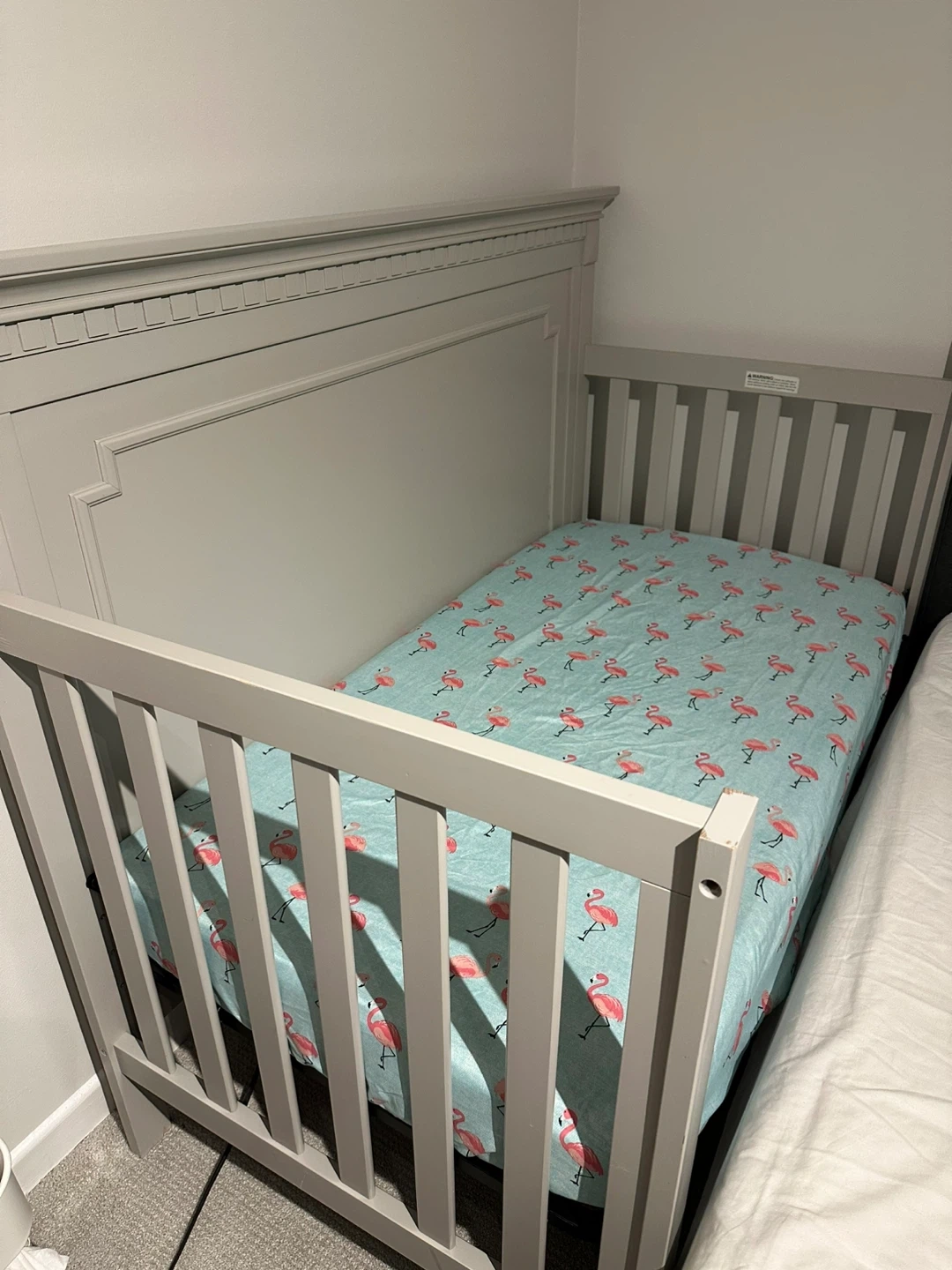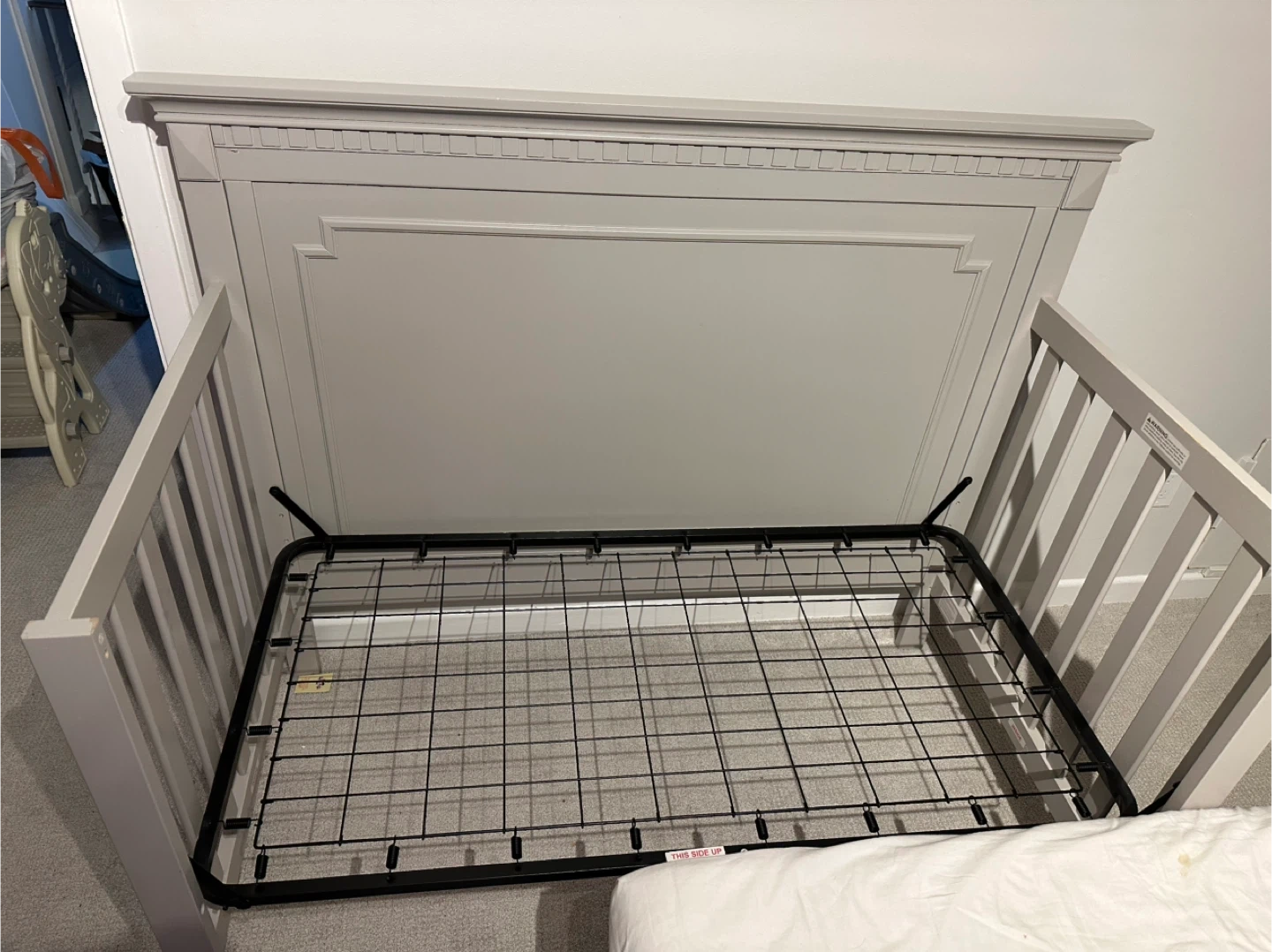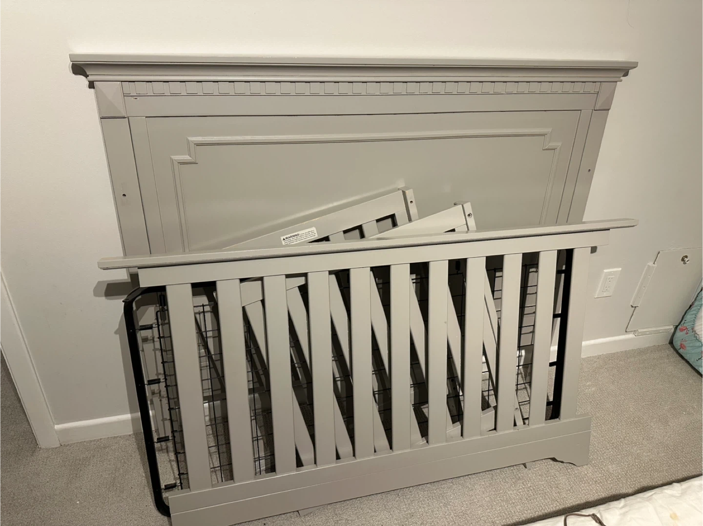 This is a grey crib for sale, the outer piece was removed for co sleeping but we have it. Crib has some cosmetic chips but is functional, this is in good condition. The height can adjust! Mattress is free with purchase of the crib.