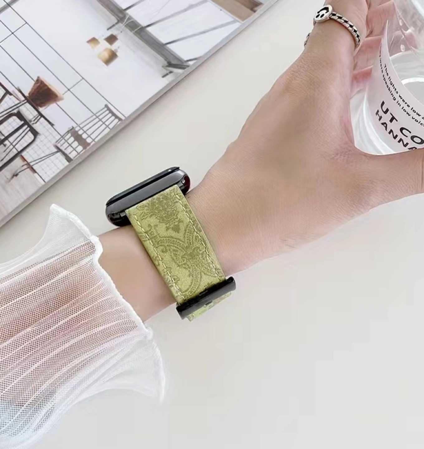 Elegant olive green leather Apple Watch band. Intricate Gucci inspired paisley pattern. Stylish accessory for your Apple Watch. Looks great with casual or dressy outfits.