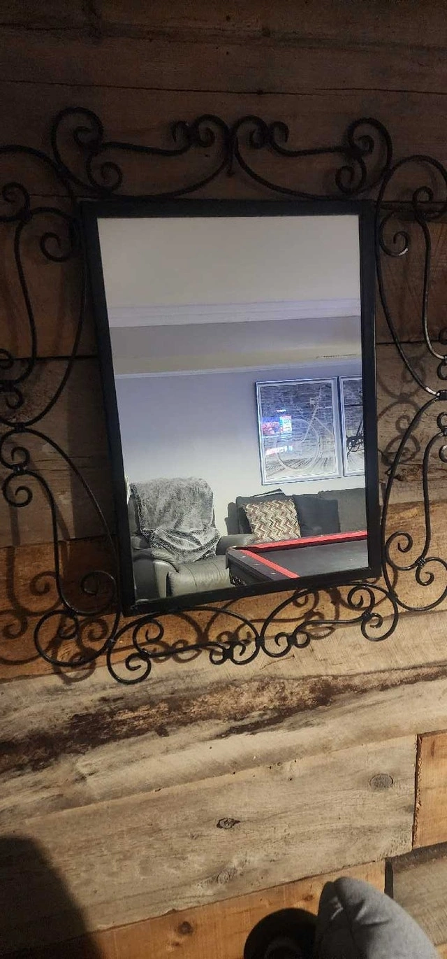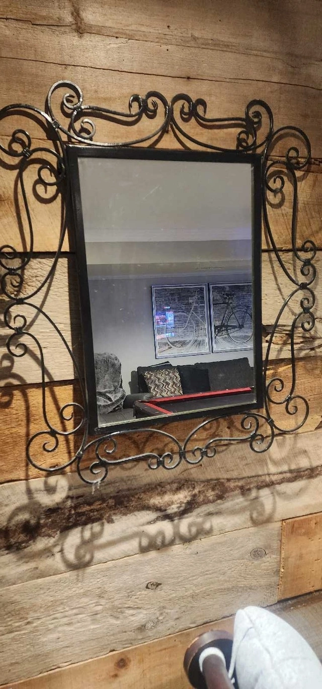 Adorn your space with this elegant, used, black metal framed mirror featuring decorative scrollwork, perfect for adding a touch of sophistication to any room. This mirror is in good condition and ready to hang. Its unique design will complement various decor styles, from modern to vintage. Here are some details: * Frame Material: Metal * Frame Colour: Black * Style: Decorative Looking around Kijiji, similar mirrors are selling between $40 and $80. I've priced mine competitively for a quick sale. If the ad is up, the mirror is available.
