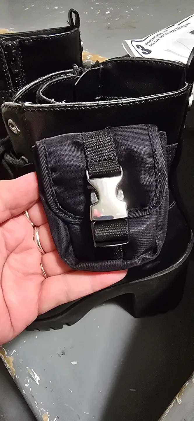 These black combat boots from Madden NYC feature a side zipper and lace-up front. They have a chunky heel and a removable pouch detail on the ankle. Size 8.