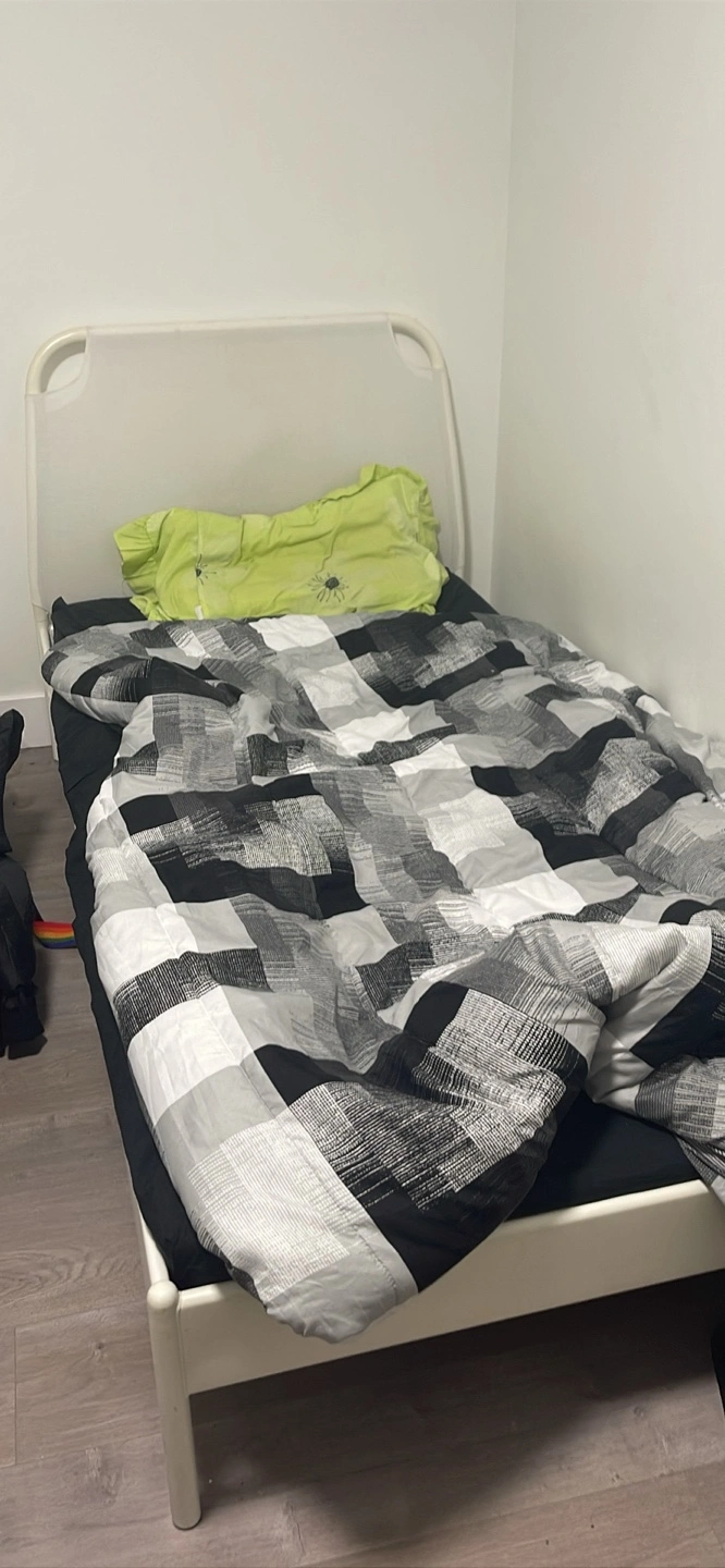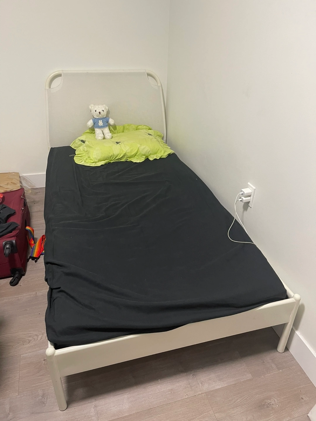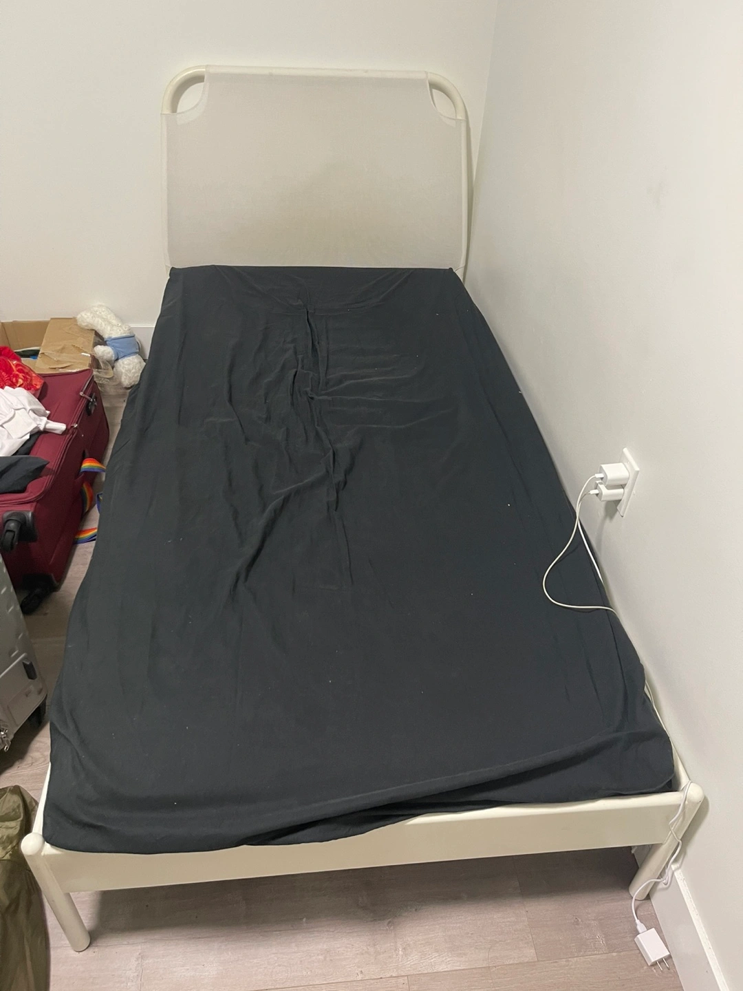 Selling my single bed (metal frame + mattress + bed cover as shown) for just $100– originally bought for $179.99.