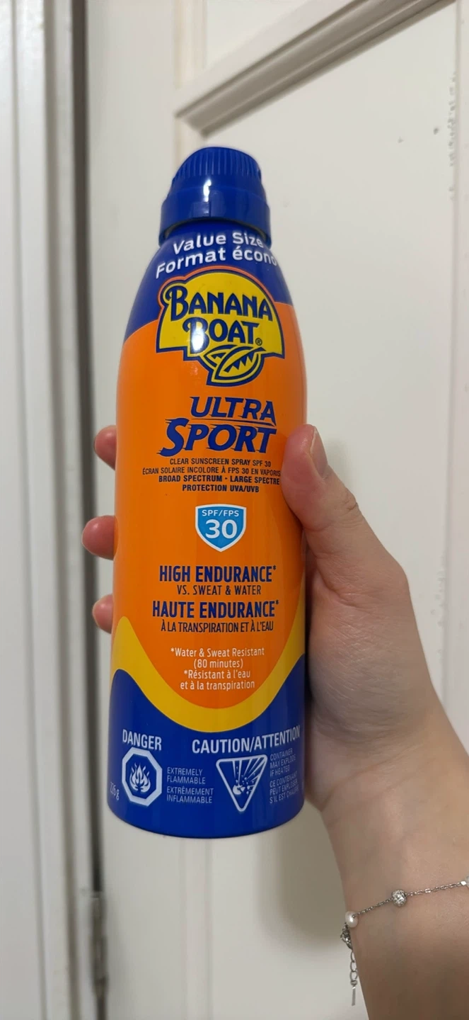 This Banana Boat Ultra Sport sunscreen spray offers SPF 30 protection. It's a clear, broad-spectrum formula designed for high endurance against sweat and water, lasting up to 80 minutes. It's extremely flammable, so keep it away from heat and flames.