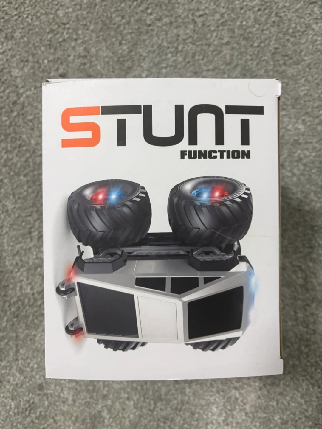 This is a Stunt Function remote control monster truck. It's a silver and black vehicle with large off-road tires. Lights flash when it's operating.