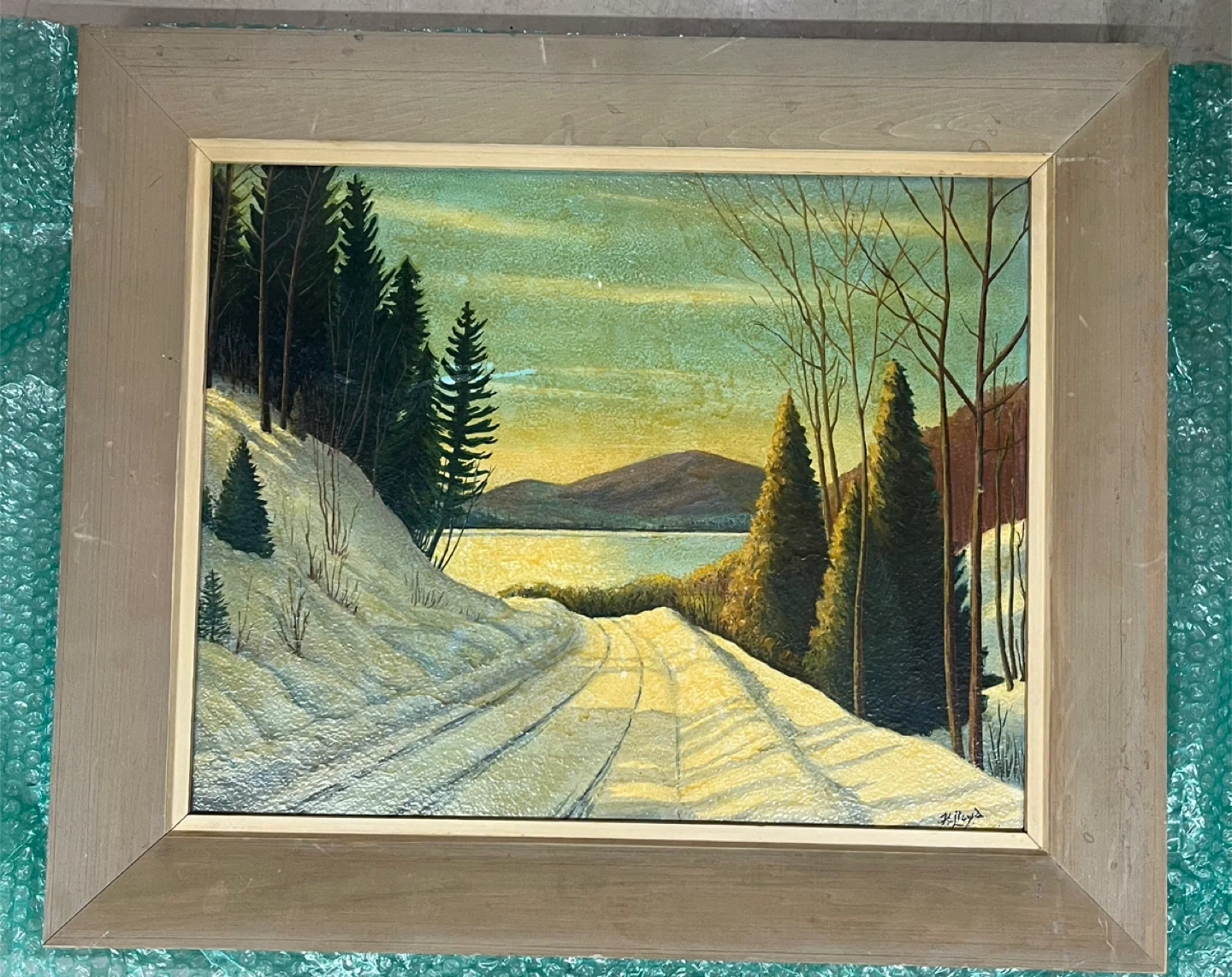 This is a framed painting of a snowy winter landscape with trees and a lake. It's a beautiful piece for any home! The painting is approximately 25x21 inches. Signed by artist.