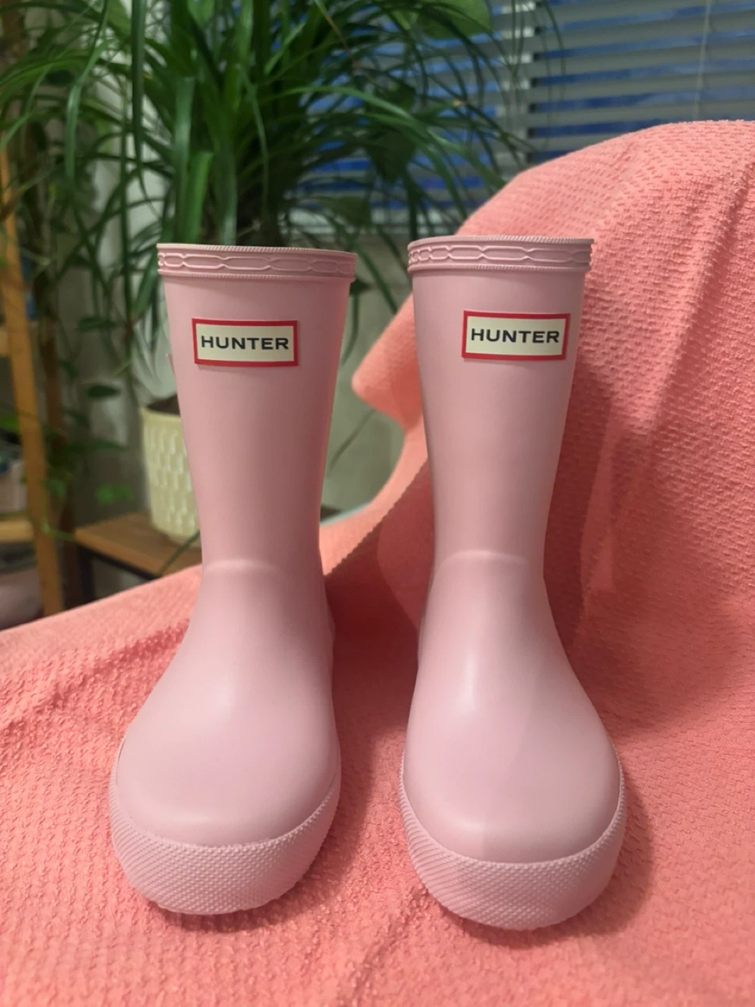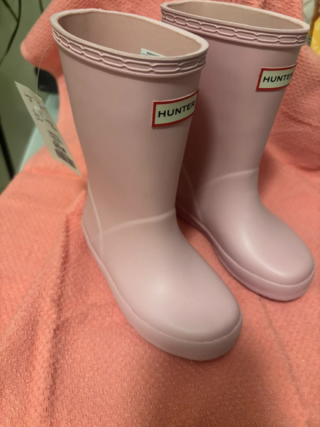 These cute pink Hunter rain boots are perfect for little ones! They're made from durable rubber and feature the classic Hunter logo. They're great for splashing in puddles on rainy days. Size US 9.
