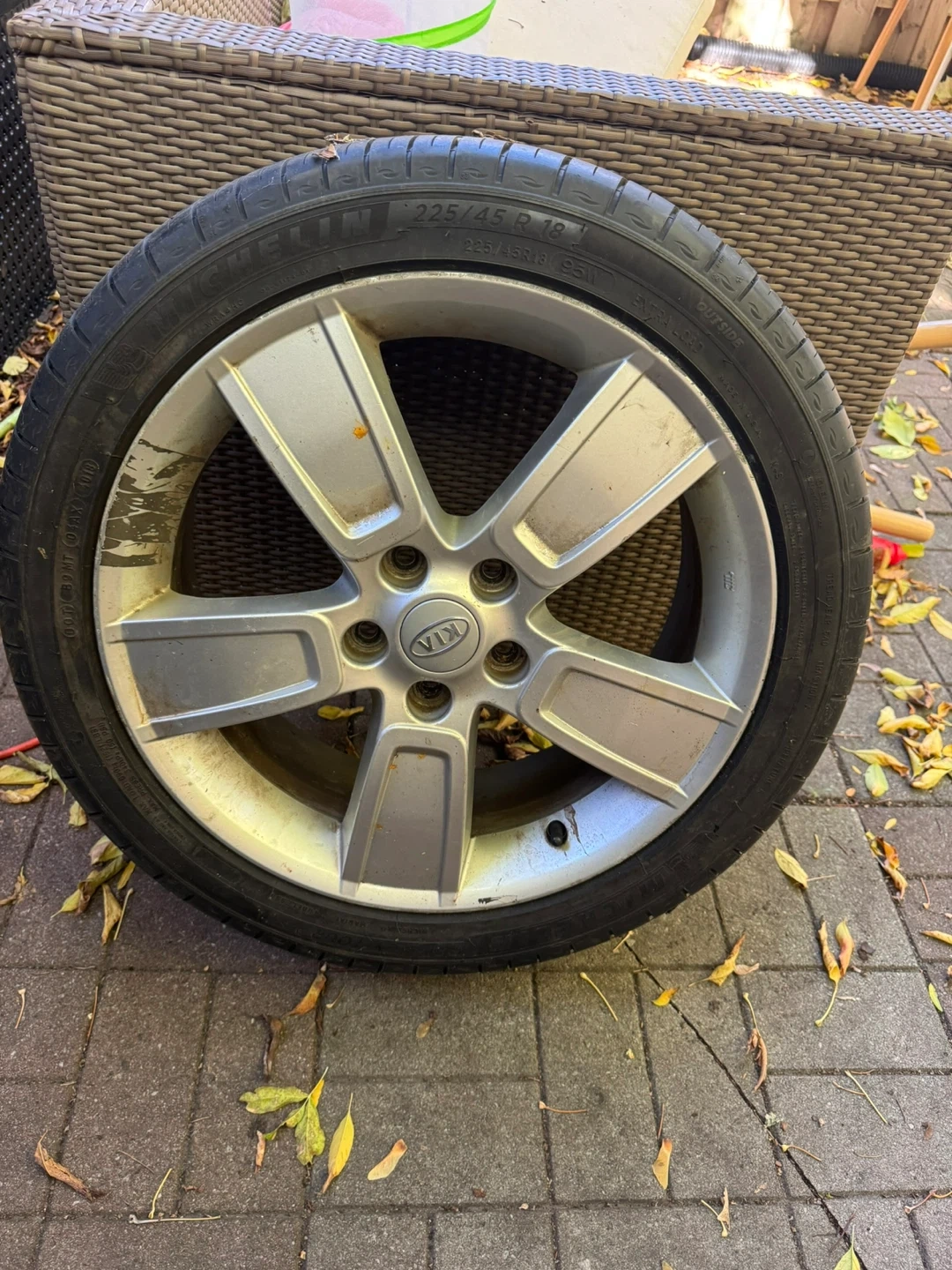 Selling four Kia rims and tire. The tire size is 225/45R18. It shows some signs of wear. I used them for one season. The rims are in very good condition. I used them in my previous Seltos. I had it for one year only.