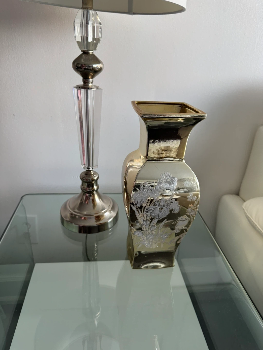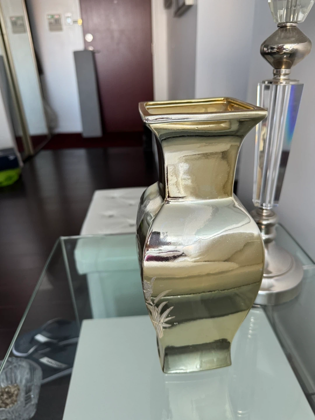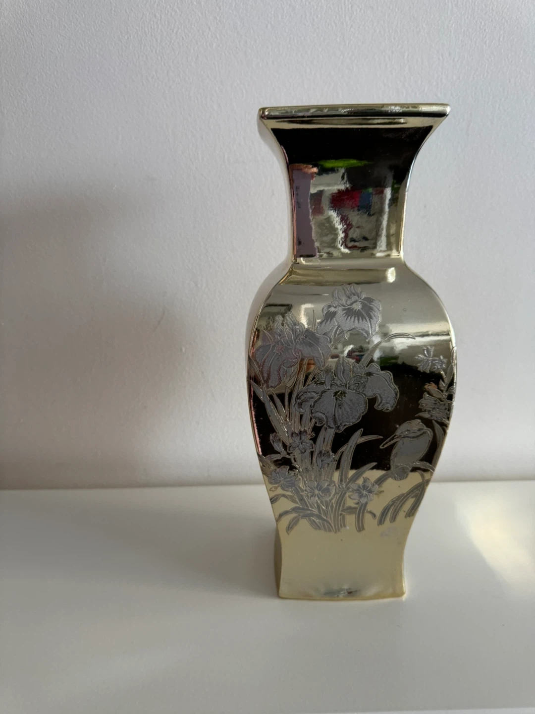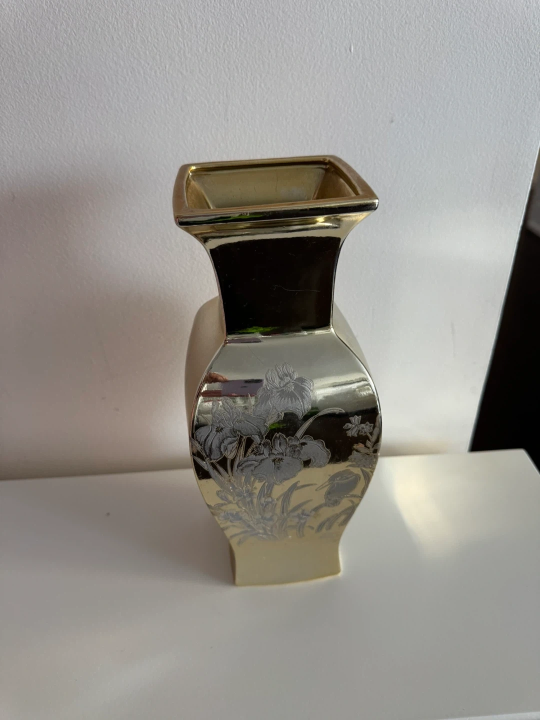 Shiny gold vase featuring a delicate silver floral and bird design. It has a unique square neck and a wider body. This vase would make a lovely decorative accent piece for any room!