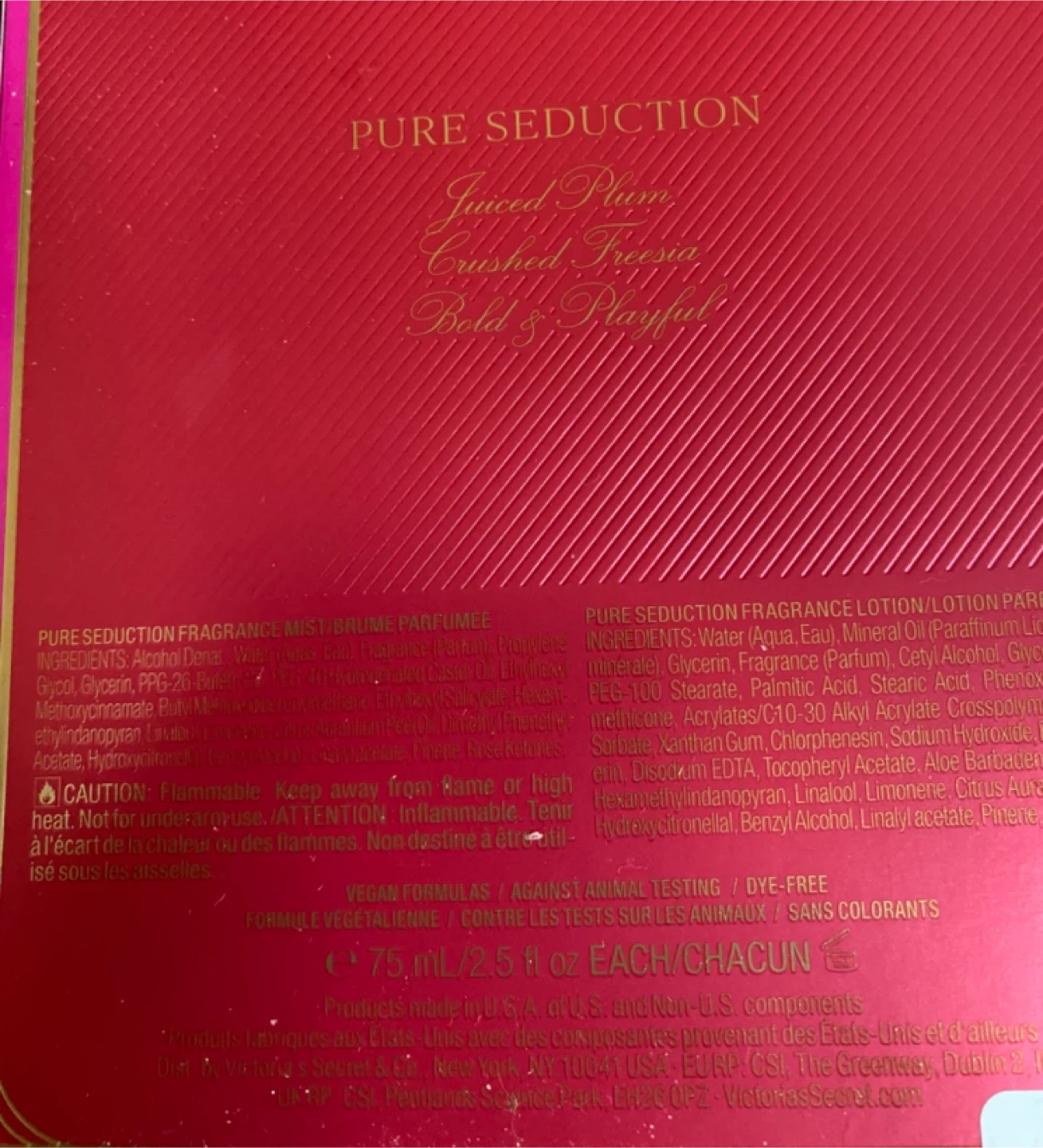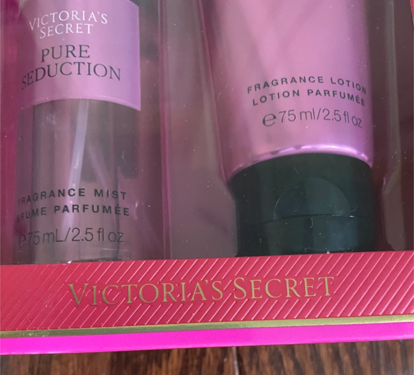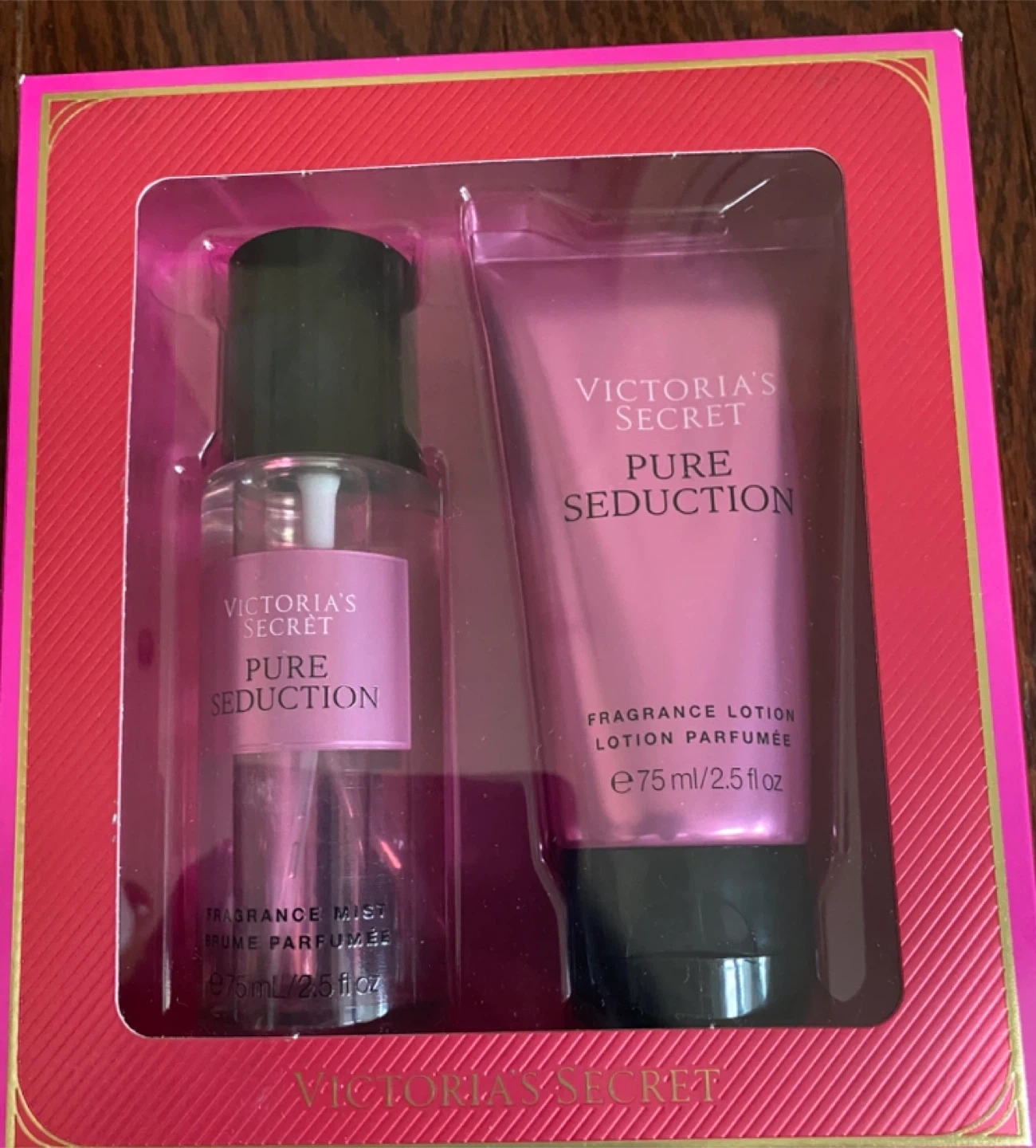 This Victoria's Secret Pure Seduction set includes a fragrance mist and a fragrance lotion. Each bottle is 75ml/2.5 fl oz. The scent notes are Juiced Plum, Crushed Freesia, and Sweet Vanilla.