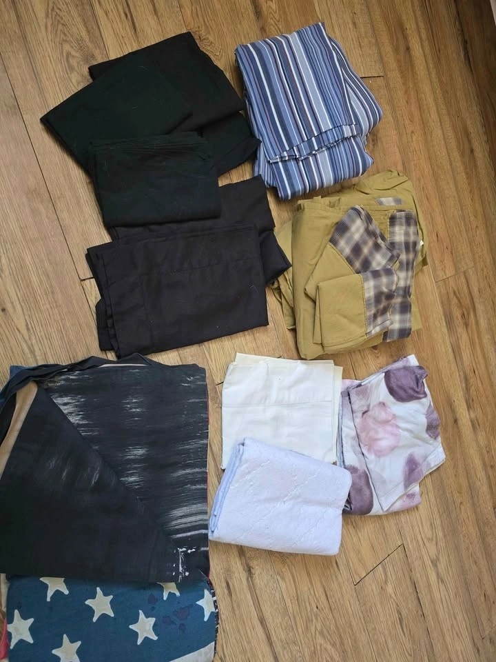 All in great shape, just been stored away and no longer needed. Includes a Queen size green set (fitted, flat & 2 pillowcases), and a single size blue striped set (fitted and flat). Also comes with 6 back pillowcases (4 basic, 2 decorative), 1 white standard pillowcase, and 2 spotted king sized pillowcases. There's also a 'mess mat' that's basically brand new, used only as protection. Lastly, a queen size duvet cover featuring an American flag on one side and the New York skyline on the other. Everything in the bag for $5.