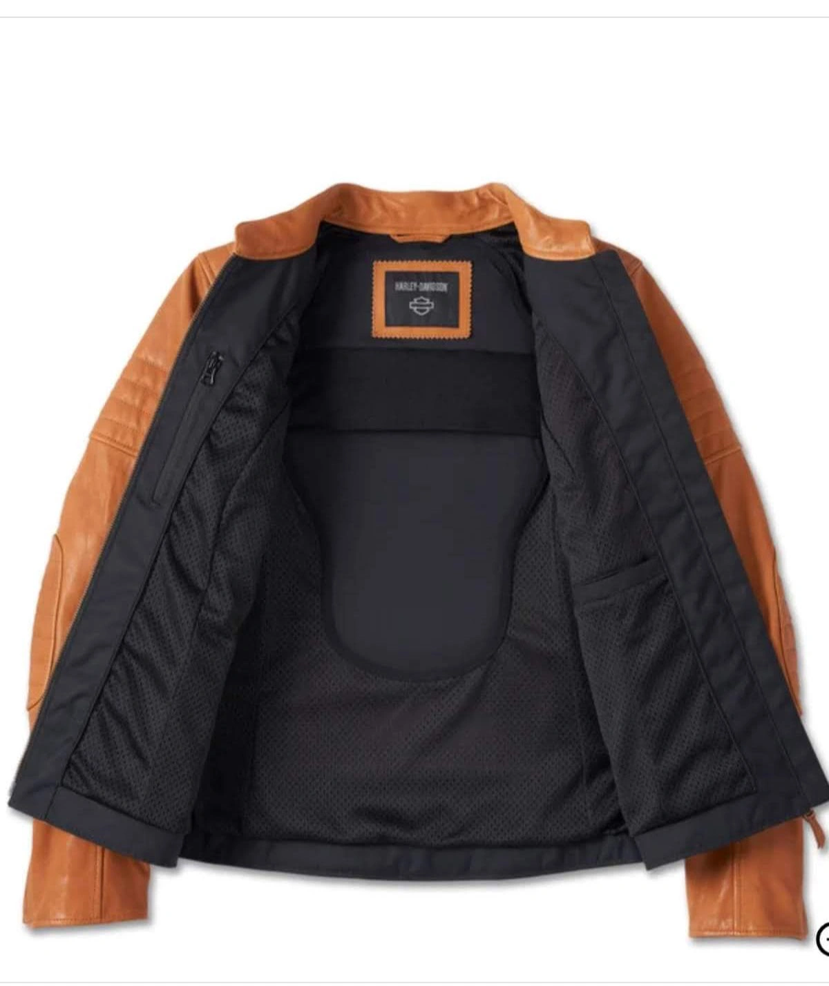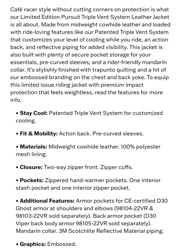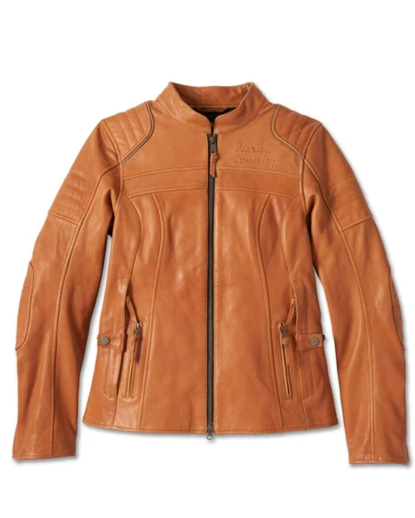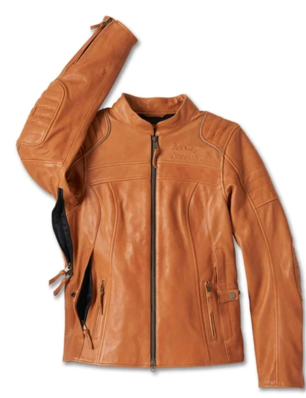 Authentic Harley-Davidson Limited Edition Women's cafe racer style leather jacket. Midweight cowhide leather. Patented Triple Vent System. Action back and pre-curved sleeves. Zippered hand-warmer pockets. Interior stash pocket. Embossed Harley-Davidson logo. 3M Scotchlite Reflective Material piping. Armor pockets for CE-certified D3O Ghost armor (sold separately).
