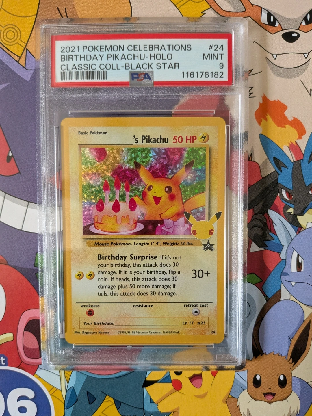 This is a 2021 Pokemon Celebrations "Birthday Pikachu" Holo card graded PSA 9 Mint. It features the "Birthday Surprise" attack. This card is part of the Classic Collection, Black Star set. It's a great addition for any Pokemon collector! Asking $100 obo