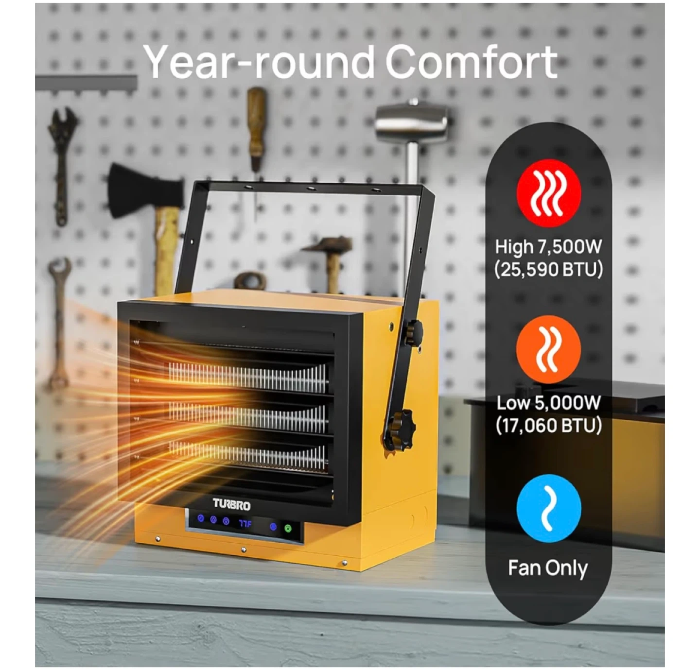 This TURBRO electric heater offers fan-forced heating for spaces up to 1,500 sq. ft. It has a temperature range of 50-95°F and features adjustable louvers and variable mounting angles. Overheat protection and ETL listing provide safety.