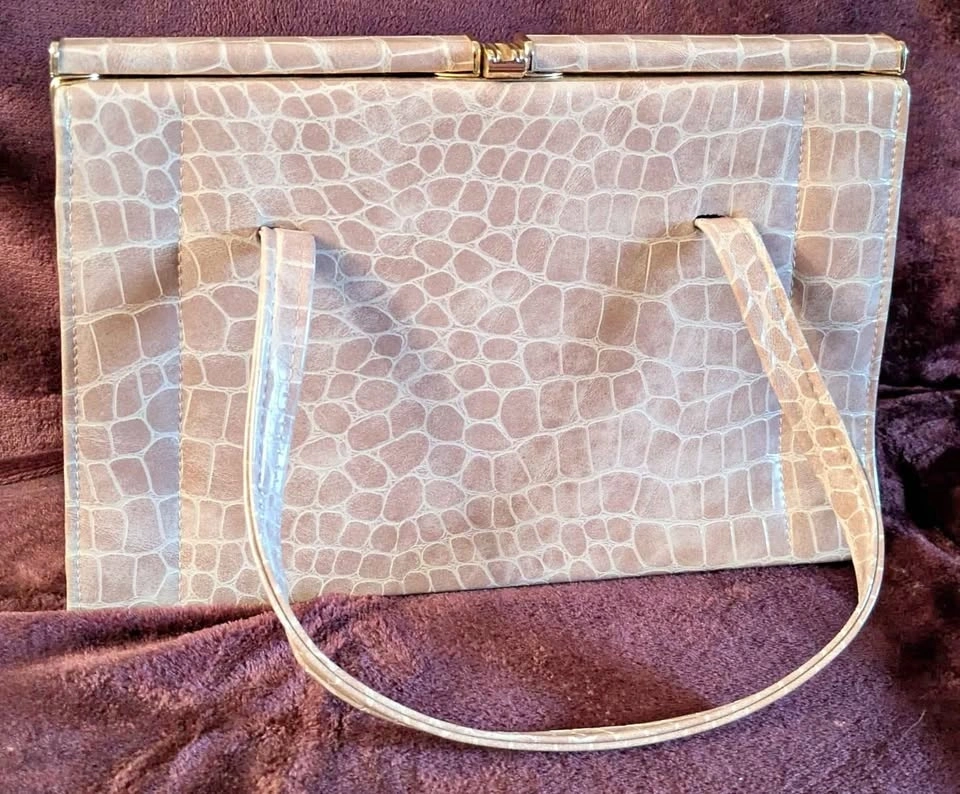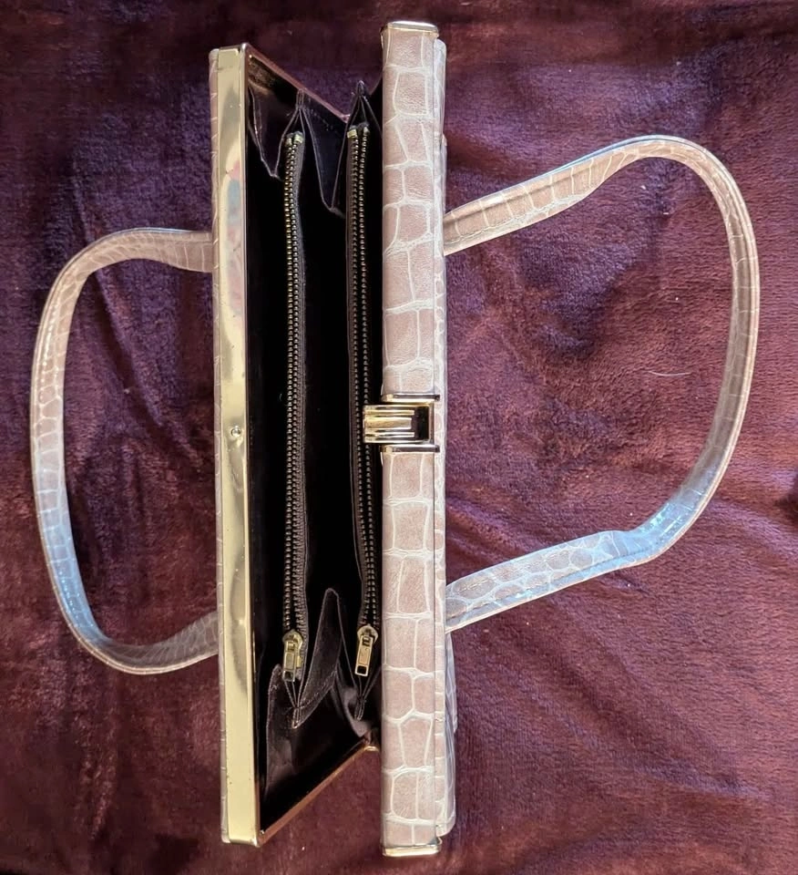 This vintage purse is in fantastic condition. It contains two zippered compartments inside and one open pouch, with the zippered compartments dividing the inner purse for convenient organization. The exterior is a pale brown/cream with brass details for the clasp and hinges. Estimated to be from the 1960s. Pickup available near Lawrence East and Midland in Scarborough.