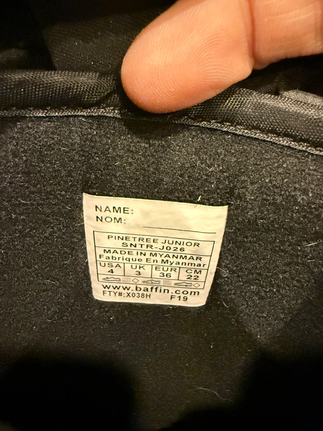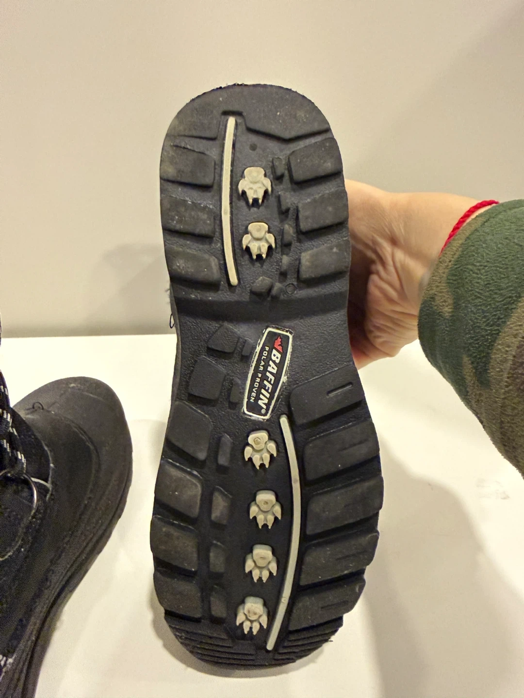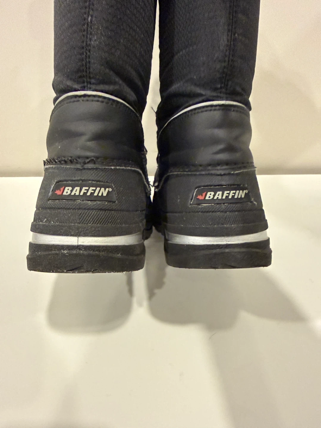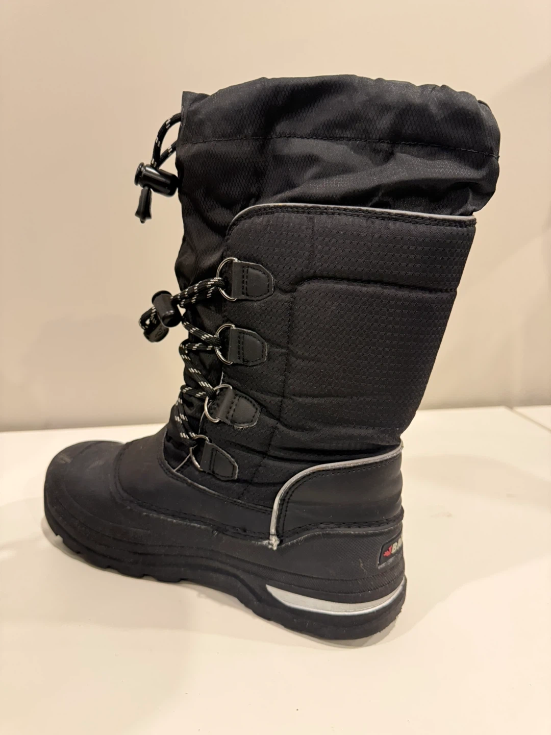 Lightly used Black Baffin snow boots with a rugged sole for traction. These boots are designed for cold weather. They feature a drawstring closure at the top for a snug fit.