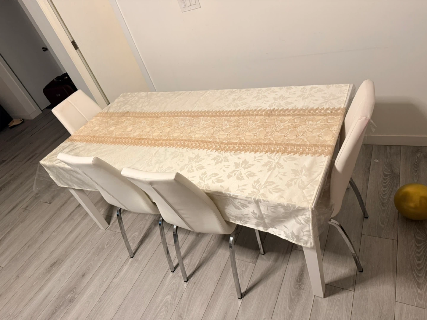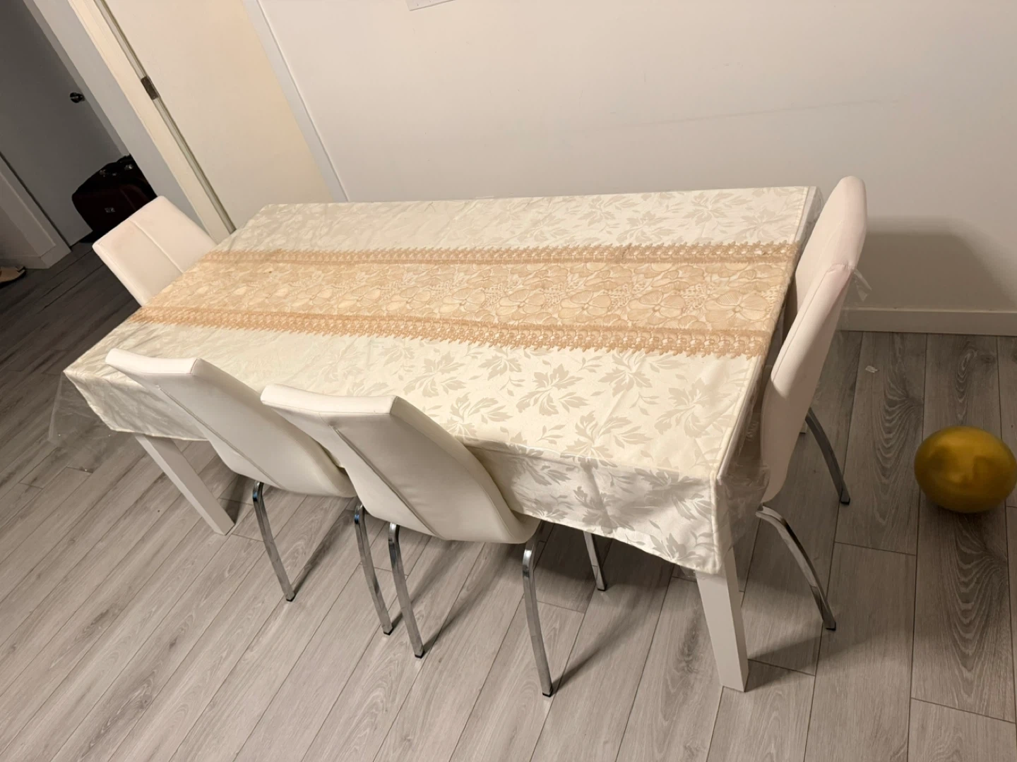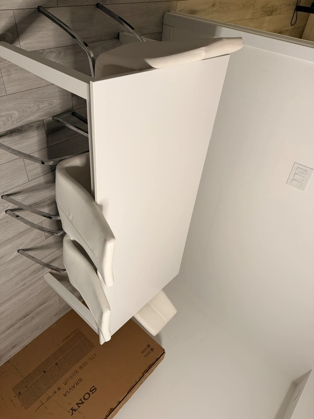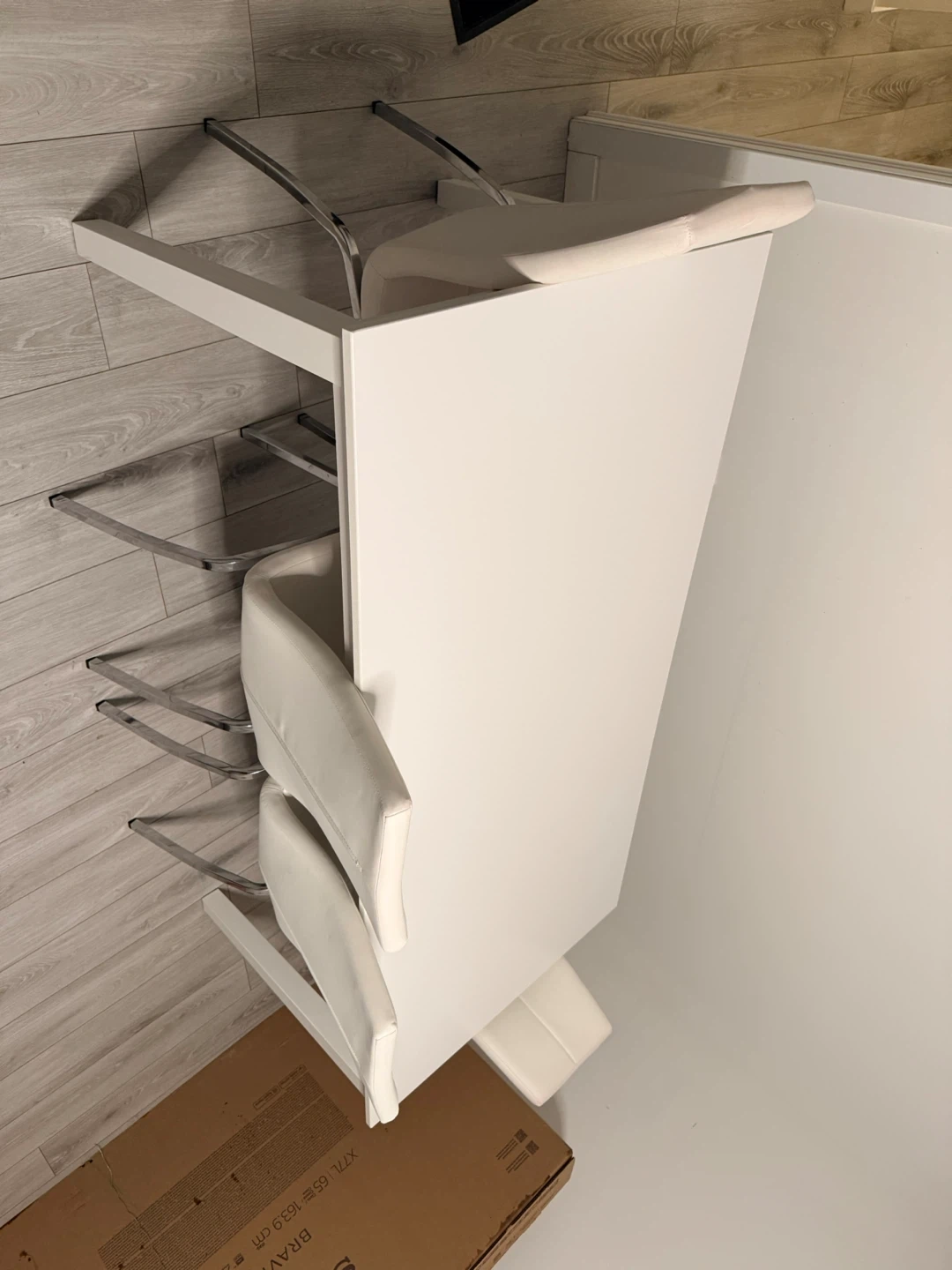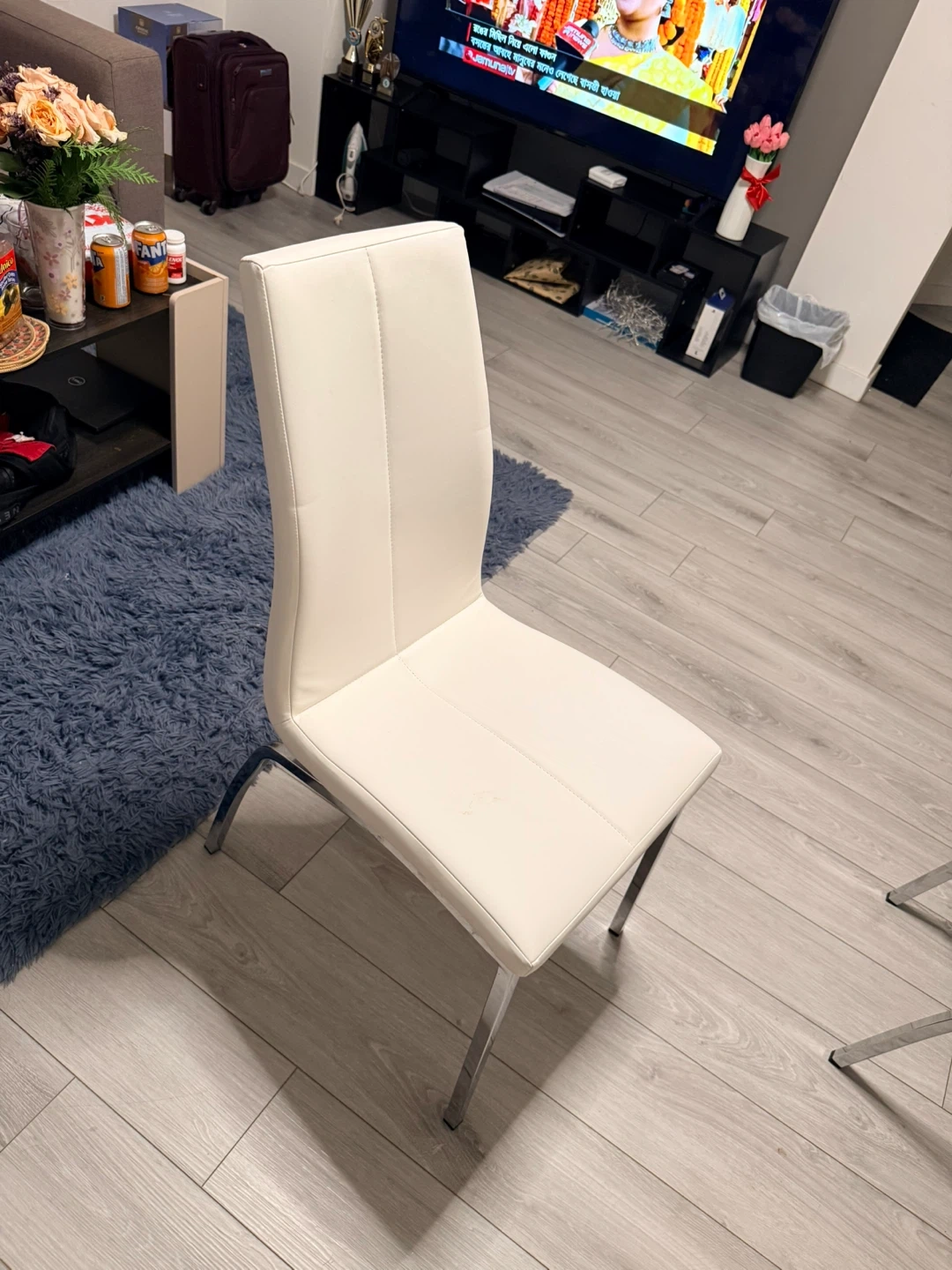 Set of four white faux leather dining chairs with chrome legs. Their sleek design fits nicely in most dining areas. Each chair measures approximately 17 inches wide by 23 inches deep and 38 inches tall.
