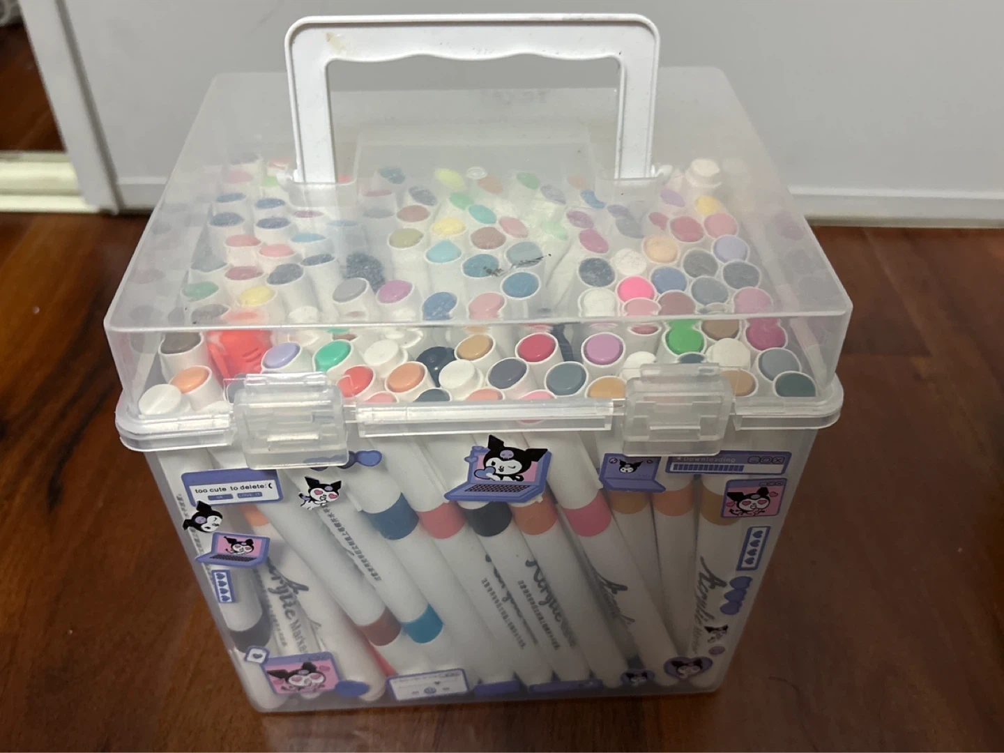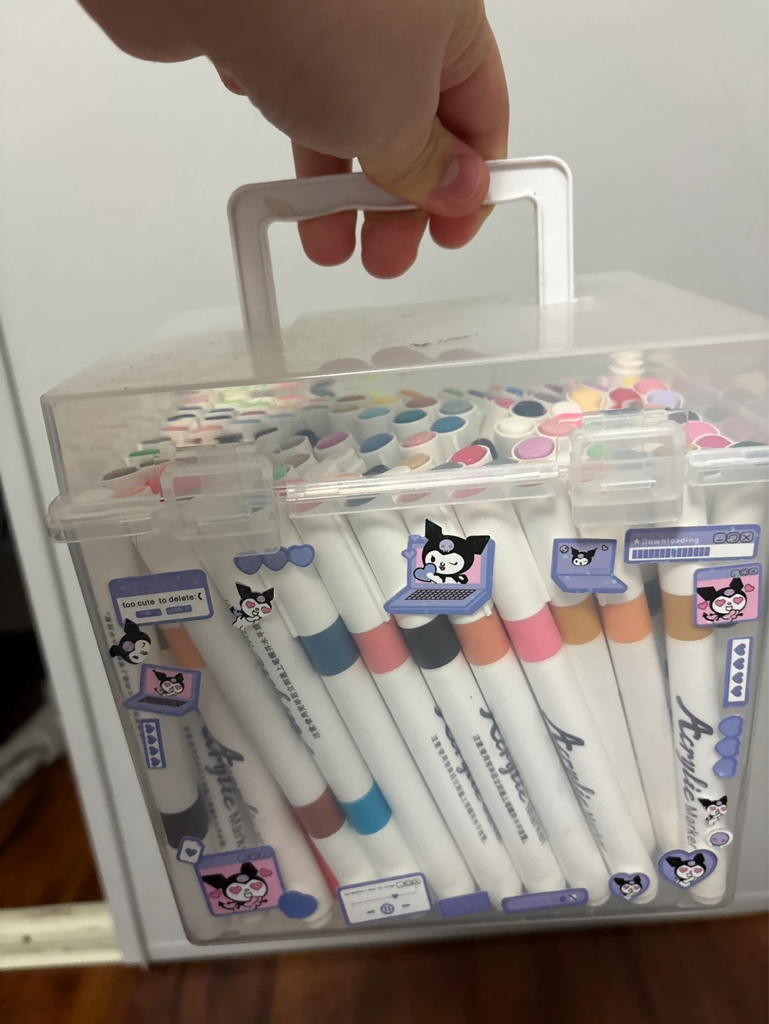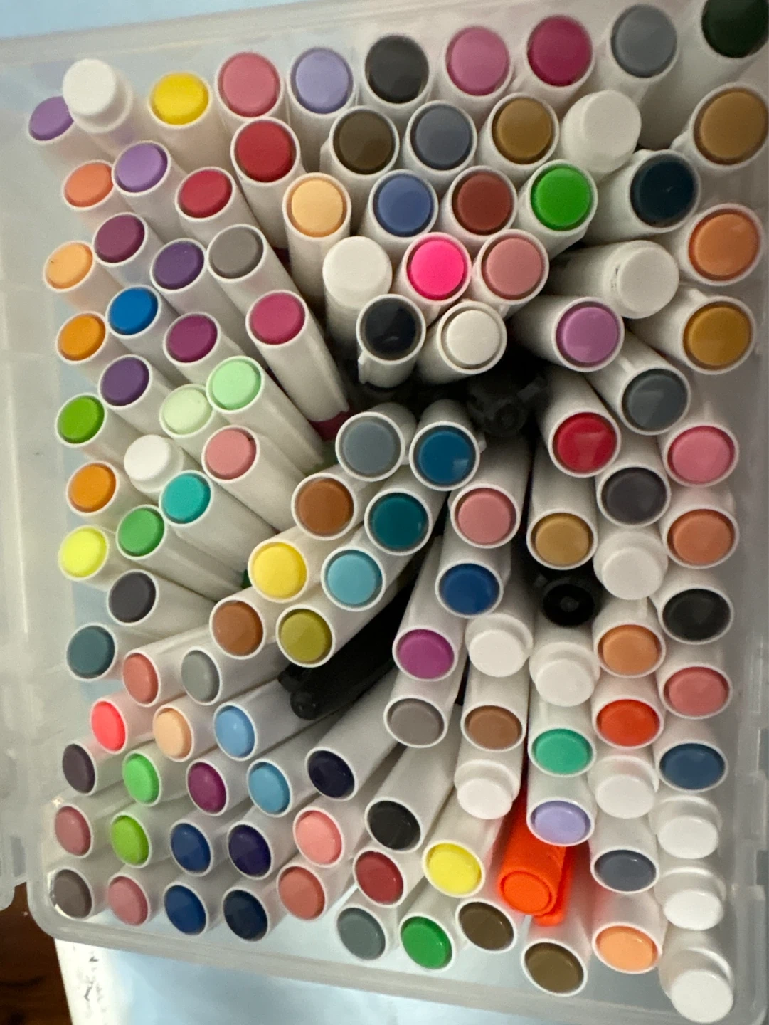 Large set of Arrtx alcohol markers in a clear carrying case. Includes a wide variety of colours for all your art projects. Markers are in a transparent plastic case with a handle for easy transport. Is around 130 colours.