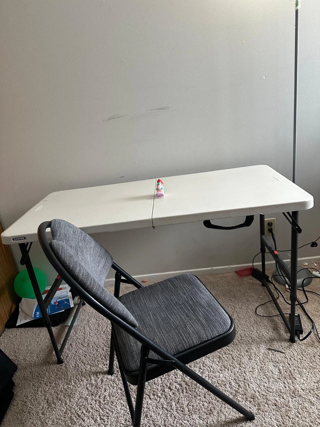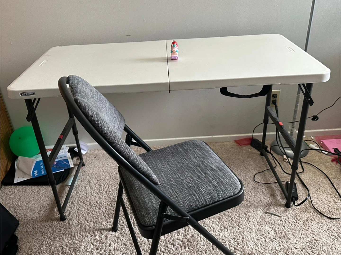 This is a white Lifetime folding table paired with a grey upholstered folding chair. The table is a convenient surface for various activities. The chair offers simple seating.