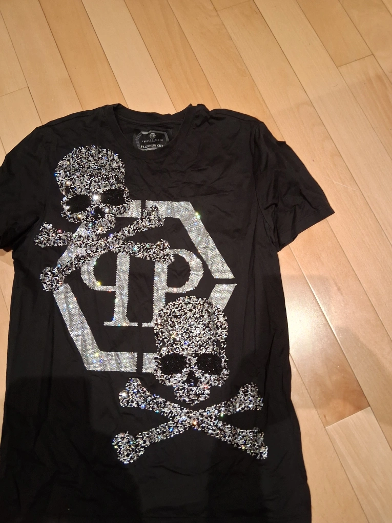 Black t-shirt featuring the iconic Philipp Plein skull and crossbones graphic. The design is embellished with sparkling rhinestones. It's made of a comfortable material.