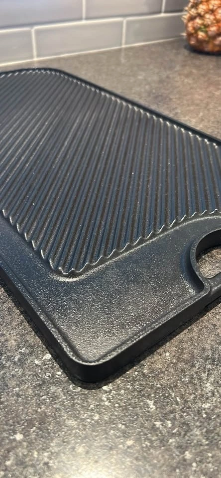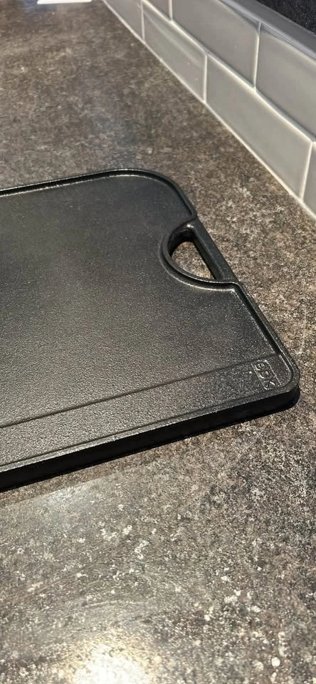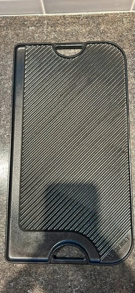 Le Creuset reversible enameled cast iron grill/griddle. Turns your stovetop into a grill in seconds. Grooved side creates beautiful grill marks for meats, fish, and skewers; smooth side is perfect for pancakes, eggs, and more. Extra-large 18½" x 10" size with built-in handles. Handmade in France. Paid over $320. Excellent condition.
