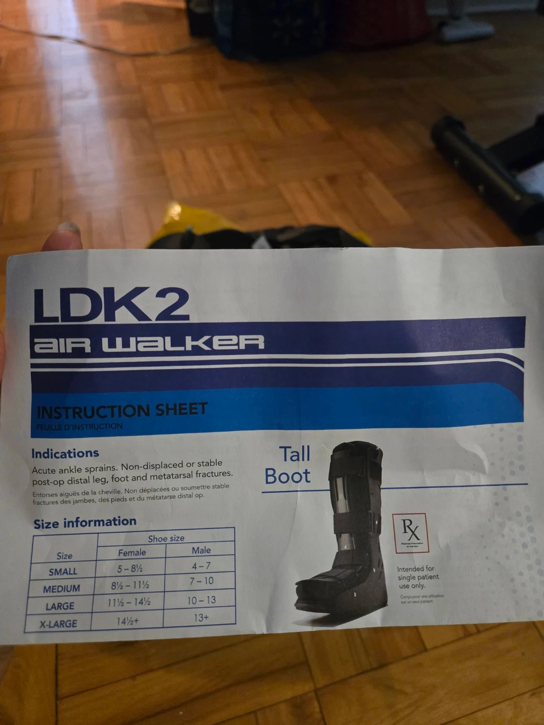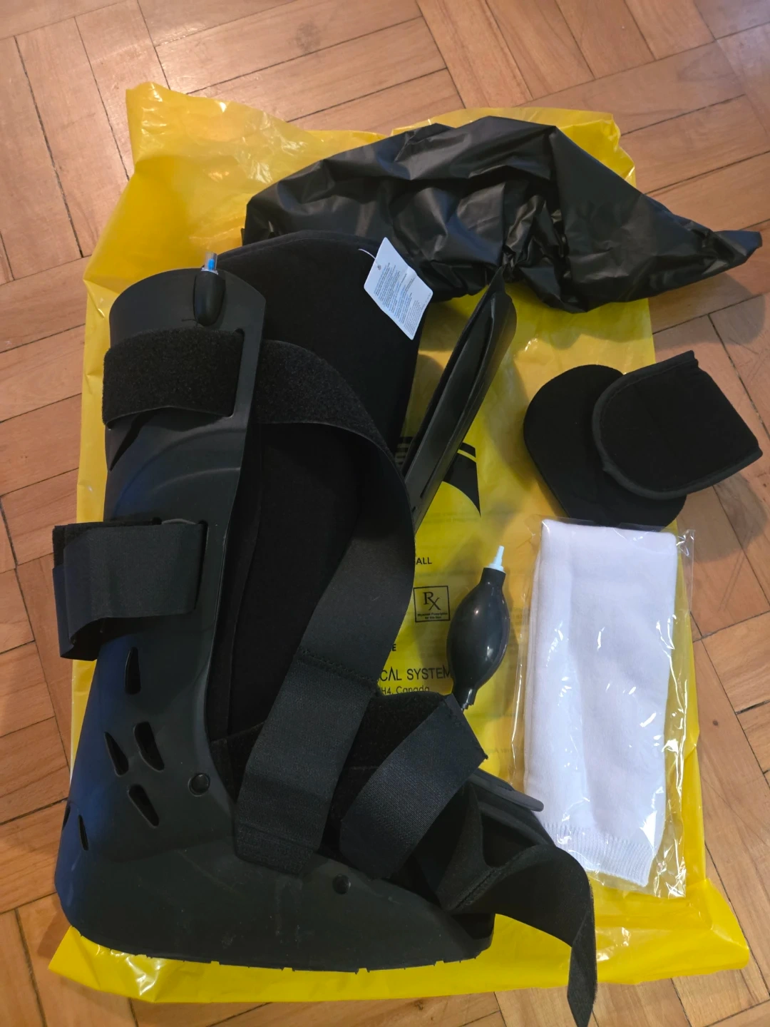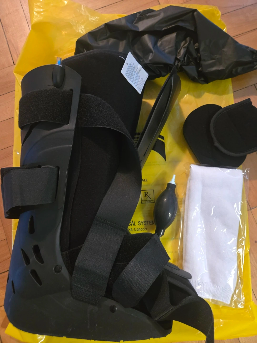 This LDK2 Air Walker tall boot is designed for acute ankle sprains, non-displaced or stable boot-strap distal leg, foot and metatarsal fractures. It's intended for single patient use and comes with an air pump for inflation. Includes a black boot, white sock, and black pads.