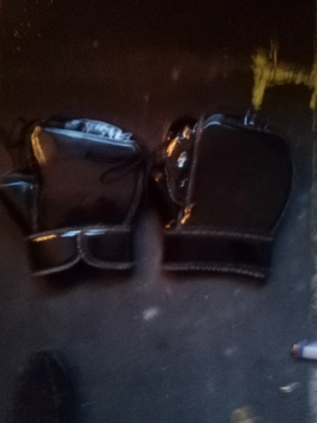 Pair of black shiny winter riding gloves. They feature lace-up closure and decorative stitching. Material appears to be faux leather.