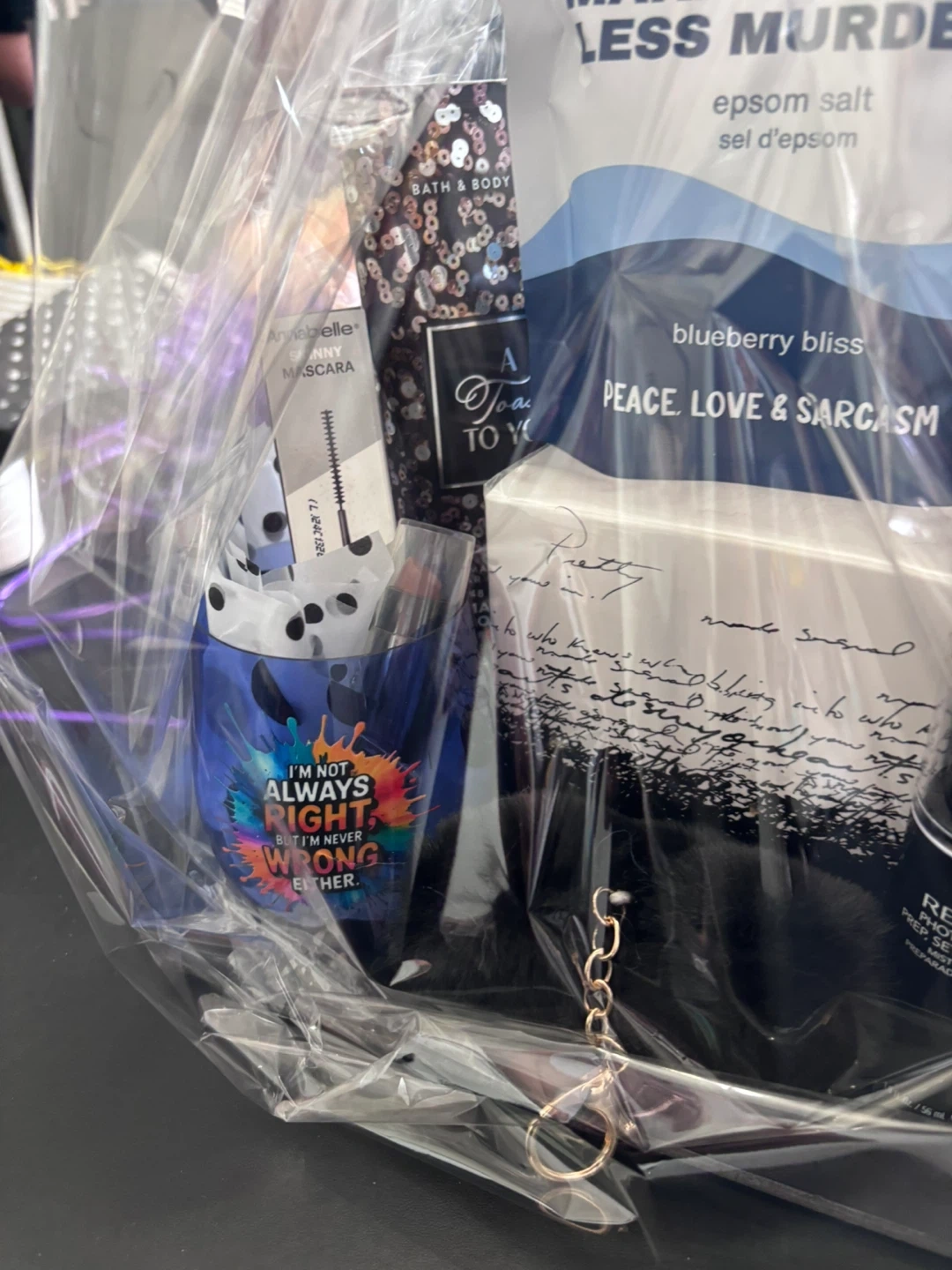 perfume , makeup accessories, and other goodies designed to spoil and delight. All arranged in a beautiful basket. value over $150