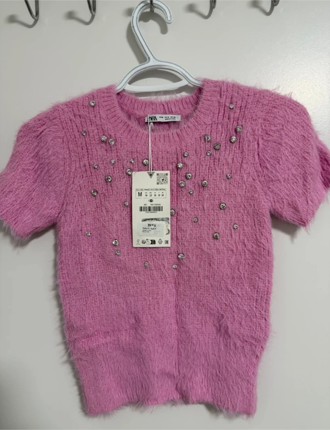 Brand new ZARA fuzzy short-sleeve sweater in a vibrant pink hue. It's adorned with sparkling rhinestones across the front. Size is medium.