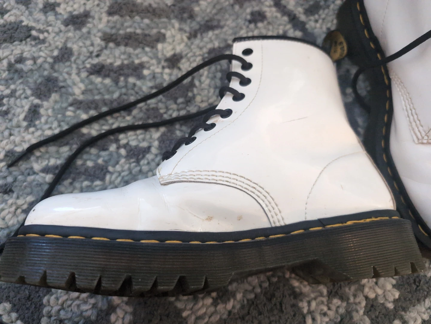 Classic Dr. Martens platform boots in a glossy white patent leather finish.